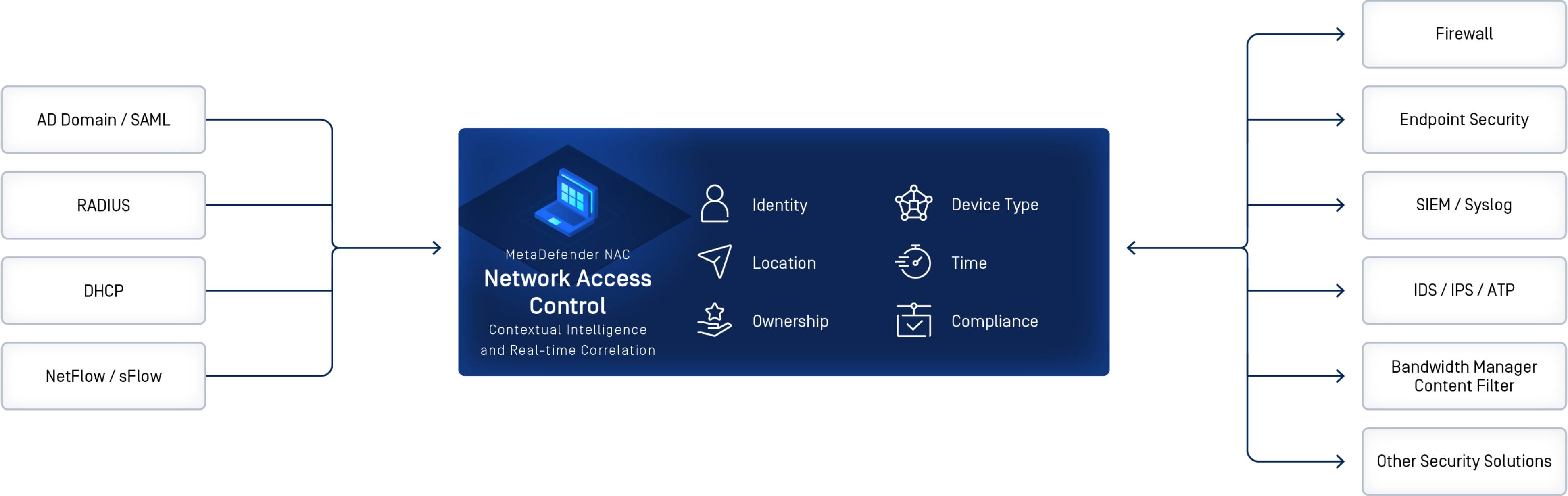 MetaDefender NAC can shares the contextual intelligence information it gathers with other security solutions such as identity-based firewalls, web content filters, SIEM, and bandwidth management solutions to enhance their capabilities well beyond the scope of traditional domain devices.