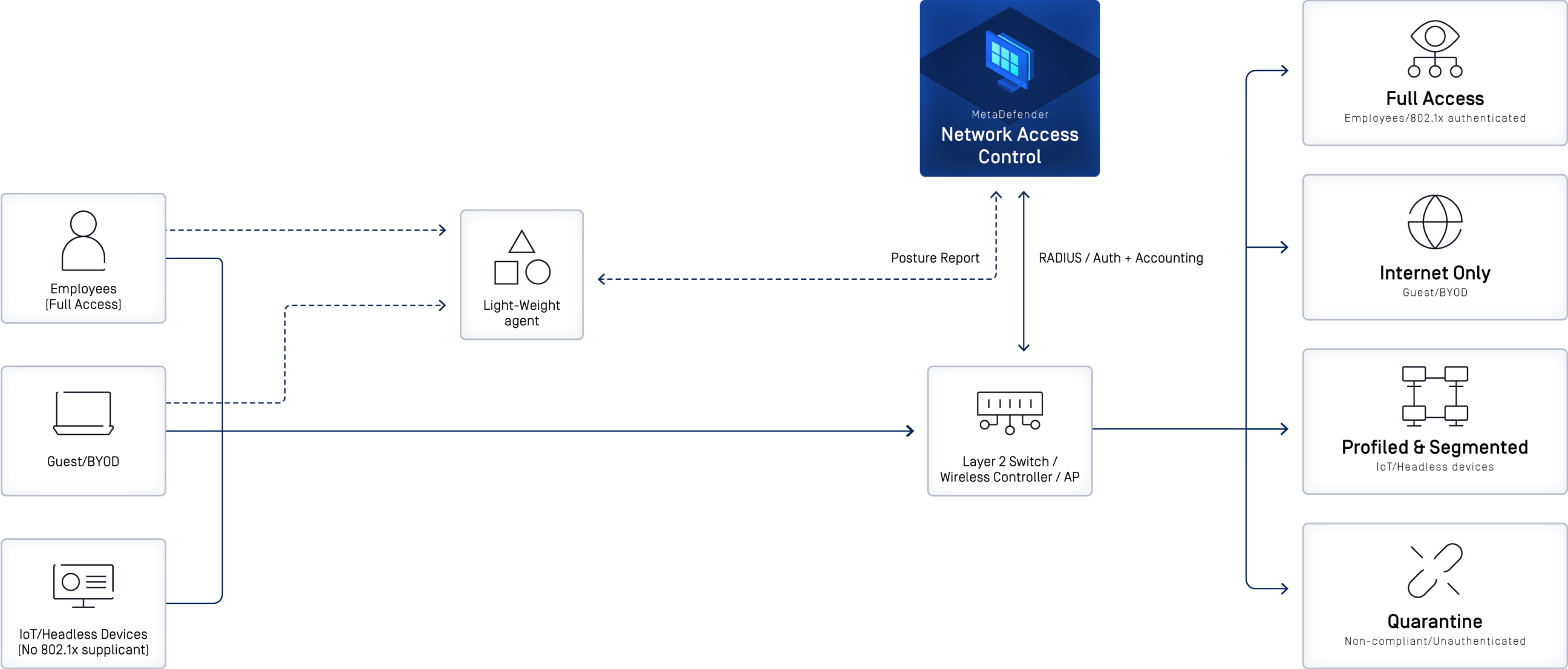 With MetaDefender NAC, you have flexible network integration options, which means that in most cases, you’ll be able to implement NAC without changing your current network infrastructure.