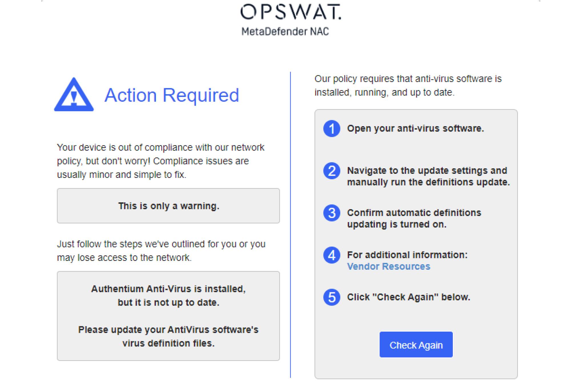 Whether it's your organization's Acceptable Use Policies (AUP) or regulatory requirements, MetaDefender NAC ensures devices on your network adhere and comply accordingly.