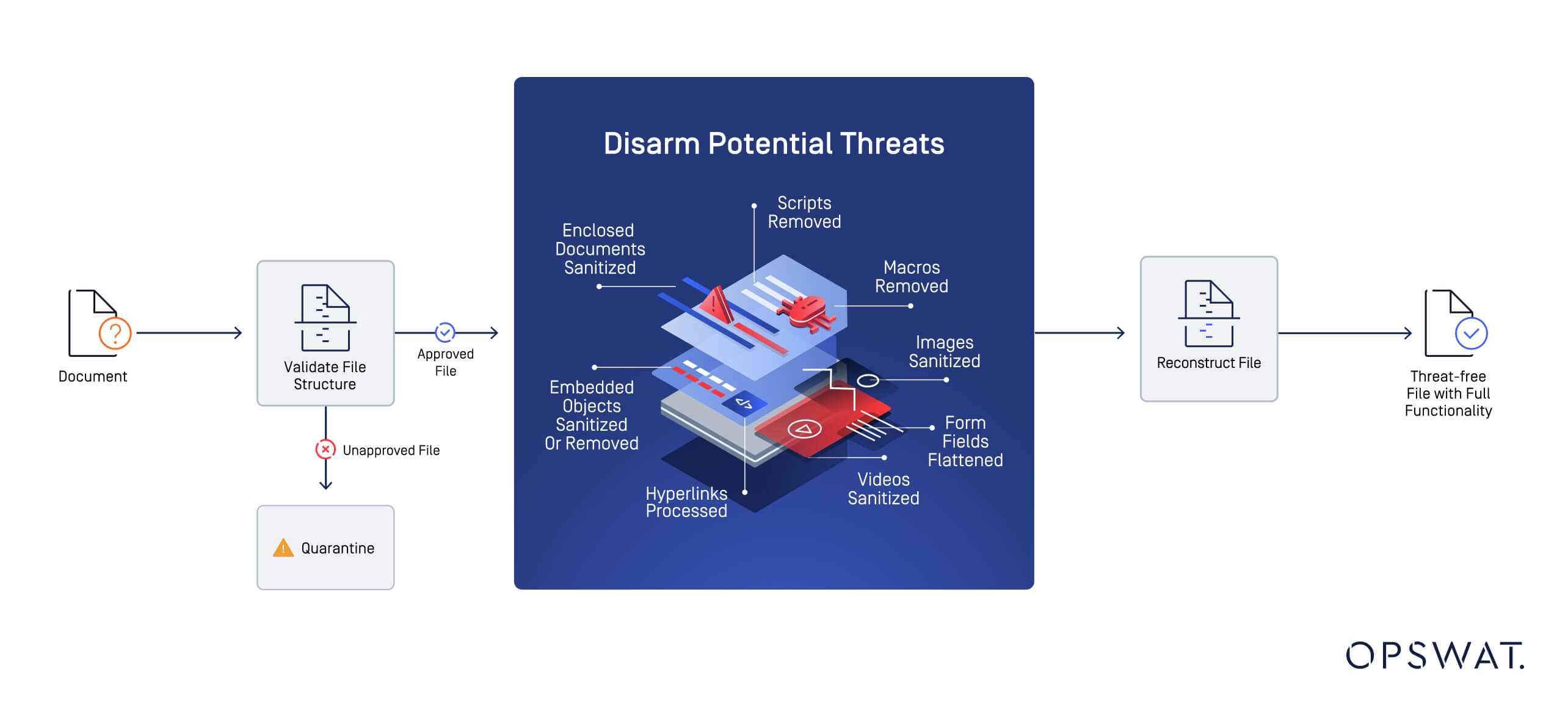 After disarming the file, CDR reconstructs it, ensuring the file remains functional without carrying over any of the malicious elements.