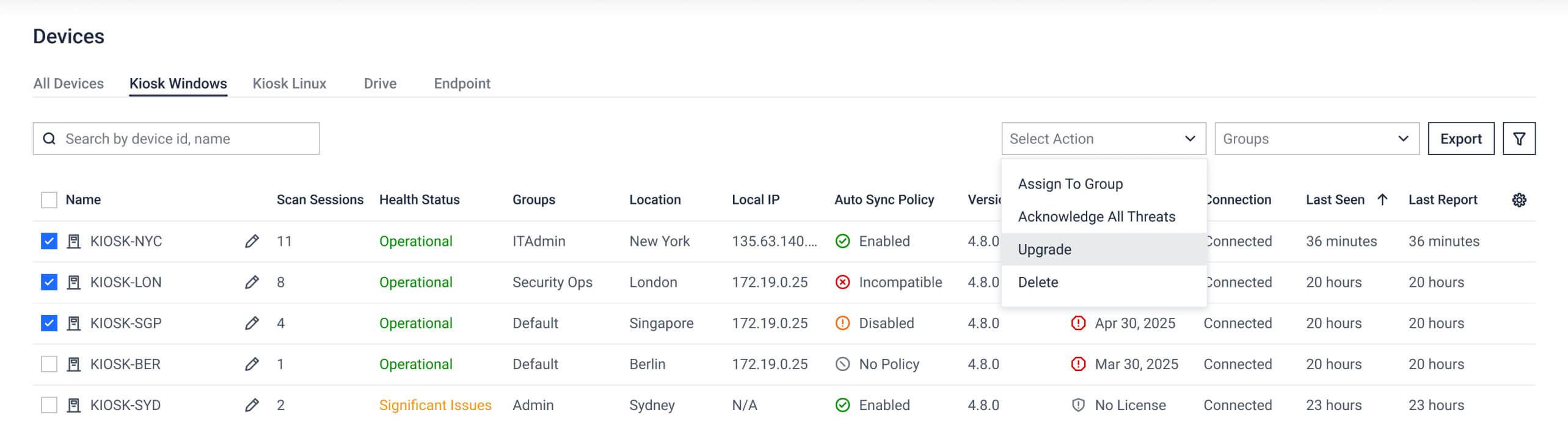2. View all enrolled MetaDefender Kiosks and select which Kiosks to update.