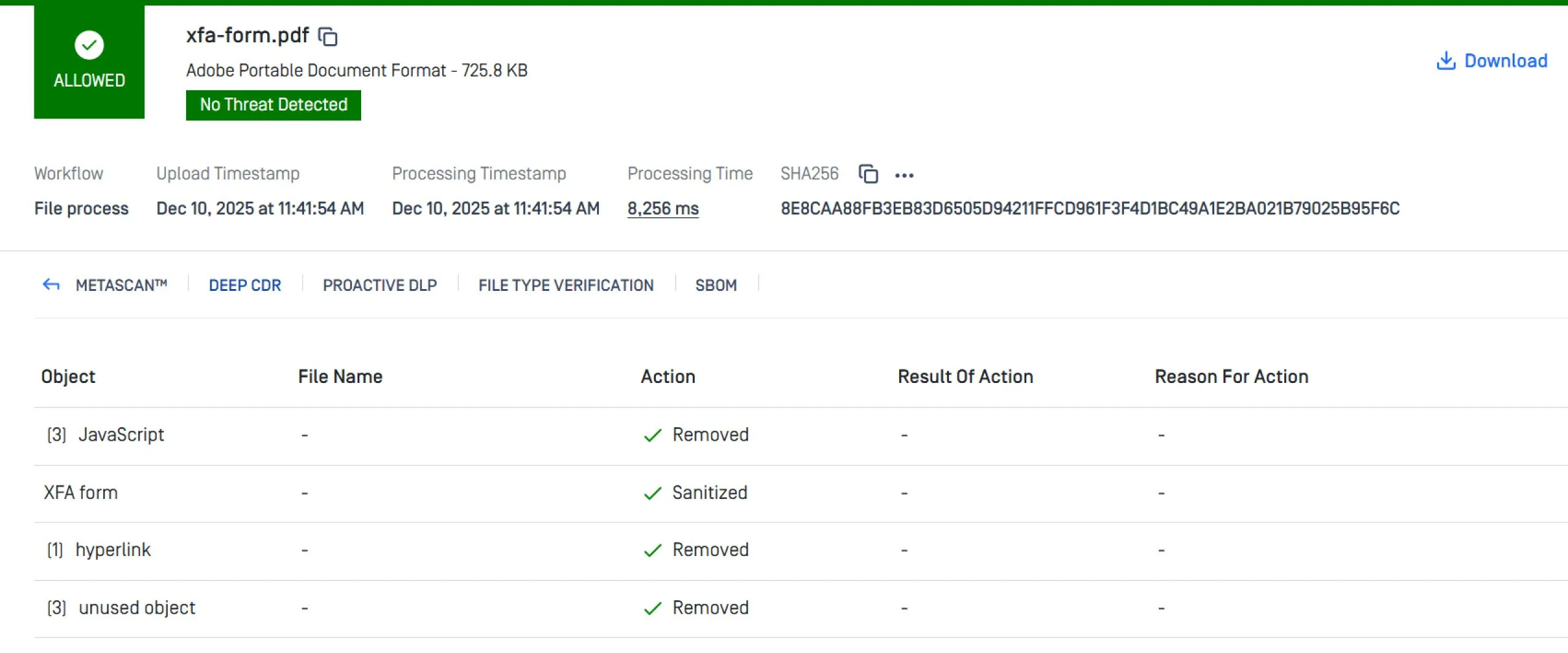 A tactical solution to mitigate CVE-2025-66516 is to sanitize all incoming PDF files before they reach Apache Tika. Deep CDR (OPSWAT’s content disarm and reconstruction technology) removes embedded XFA forms, external entity references, and any other active content that could trigger XXE attacks.