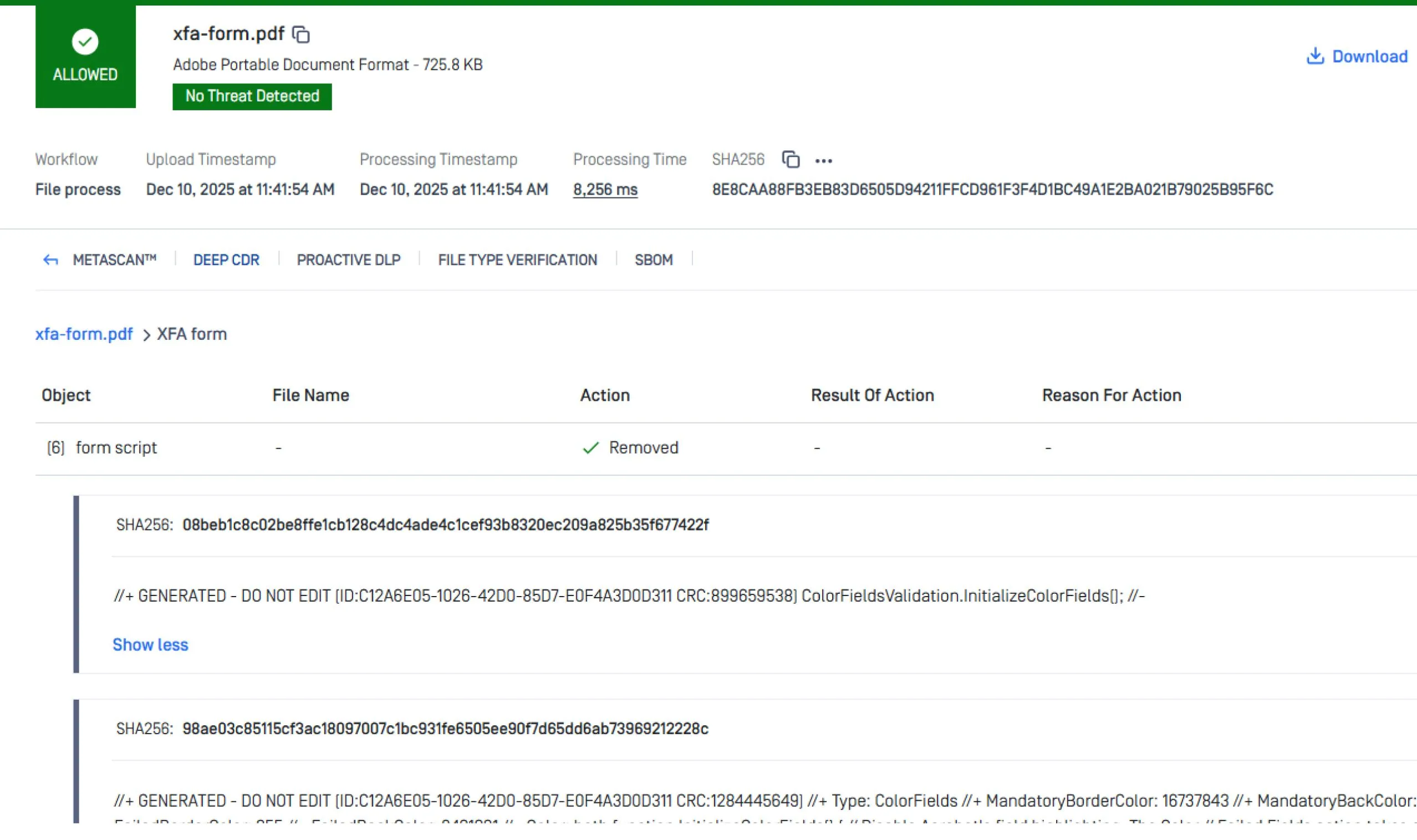 - If patching is delayed or incomplete, input file sanitization ensures that dangerous content, such as XFA forms or external entity references, is removed before it can reach vulnerable code.