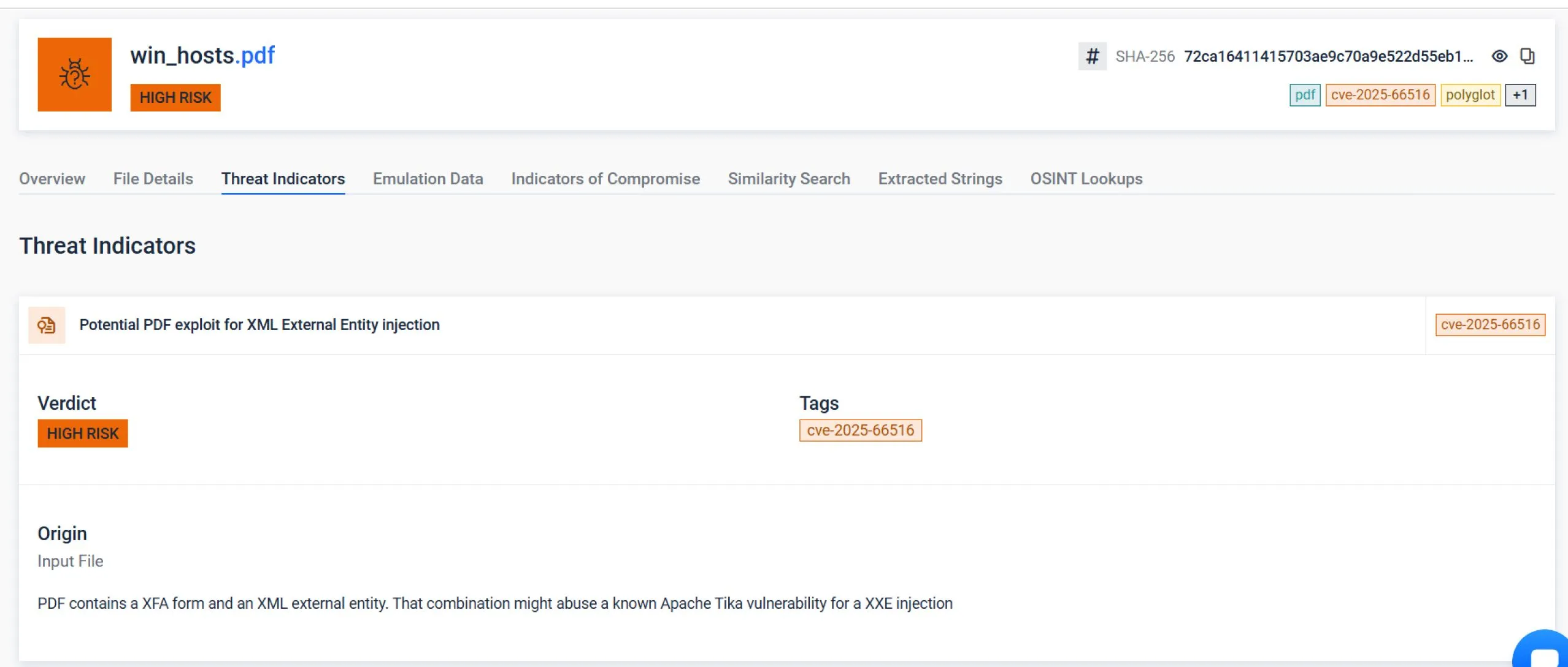 CVE-2025-66516 is a critical security flaw in Apache Tika that allows an attacker to trigger an XXE injection by submitting a specially crafted PDF with a malicious XFA form.The vulnerability affects multiple modules (tika-core versions ≤ 3.2.1, tika-pdf-module, and tika-parsers) and carries the CVSS 9.8 severity rating. If exploited, attackers could read sensitive server files, perform server-side request forgery (SSRF), or even achieve remote code execution.