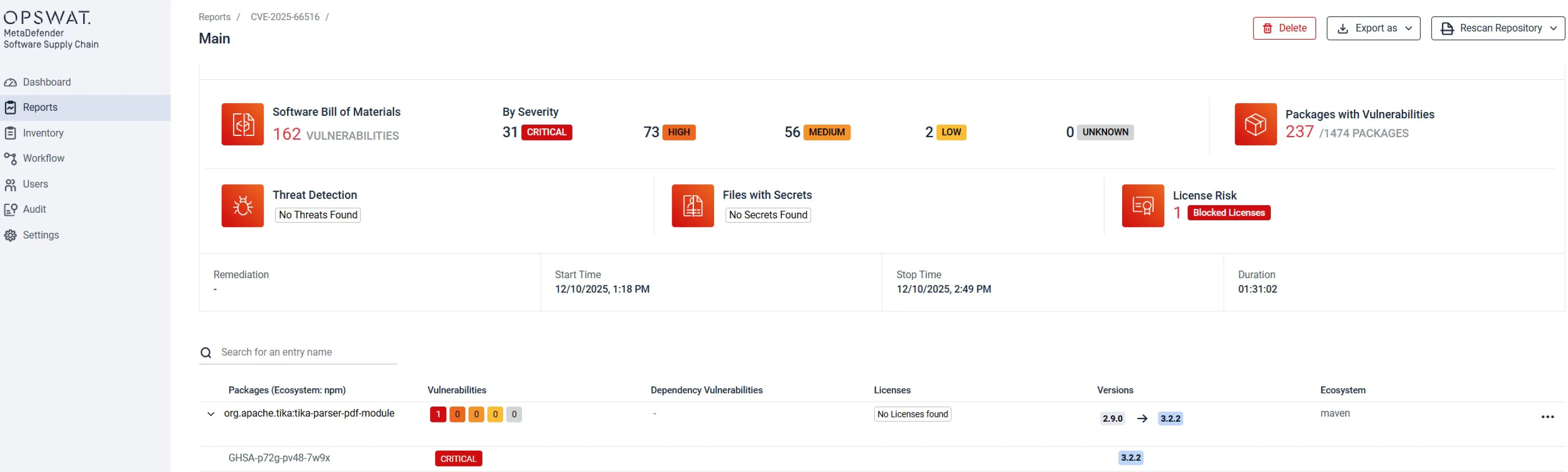 By integrating automated dependency scanning tools like SCA (software composition analysis) into CI/CD pipelines, organizations can continuously detect outdated libraries, transitive dependencies, or hidden modules that still reference Tika ≤ 3.2.1. Learn more about OPSWAT MetaDefender Software Supply Chain