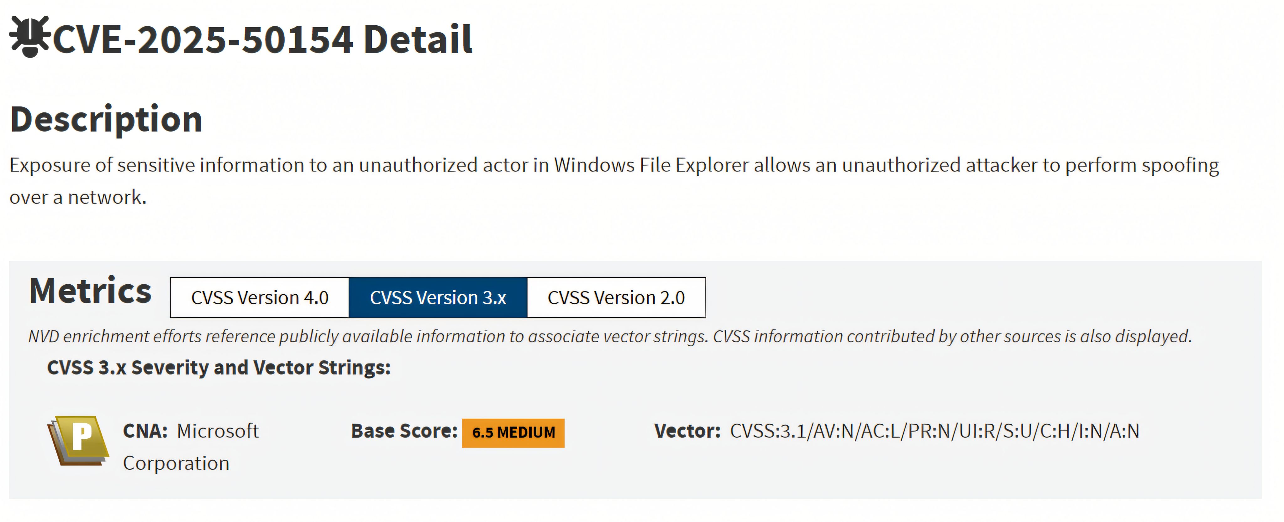 CVE-2025-50154 is a Windows File Explorer vulnerability that can expose sensitive authentication material over the network. Microsoft classifies the issue as spoofing, with the underlying weakness mapped to CWE-200 (Exposure of Sensitive Information).