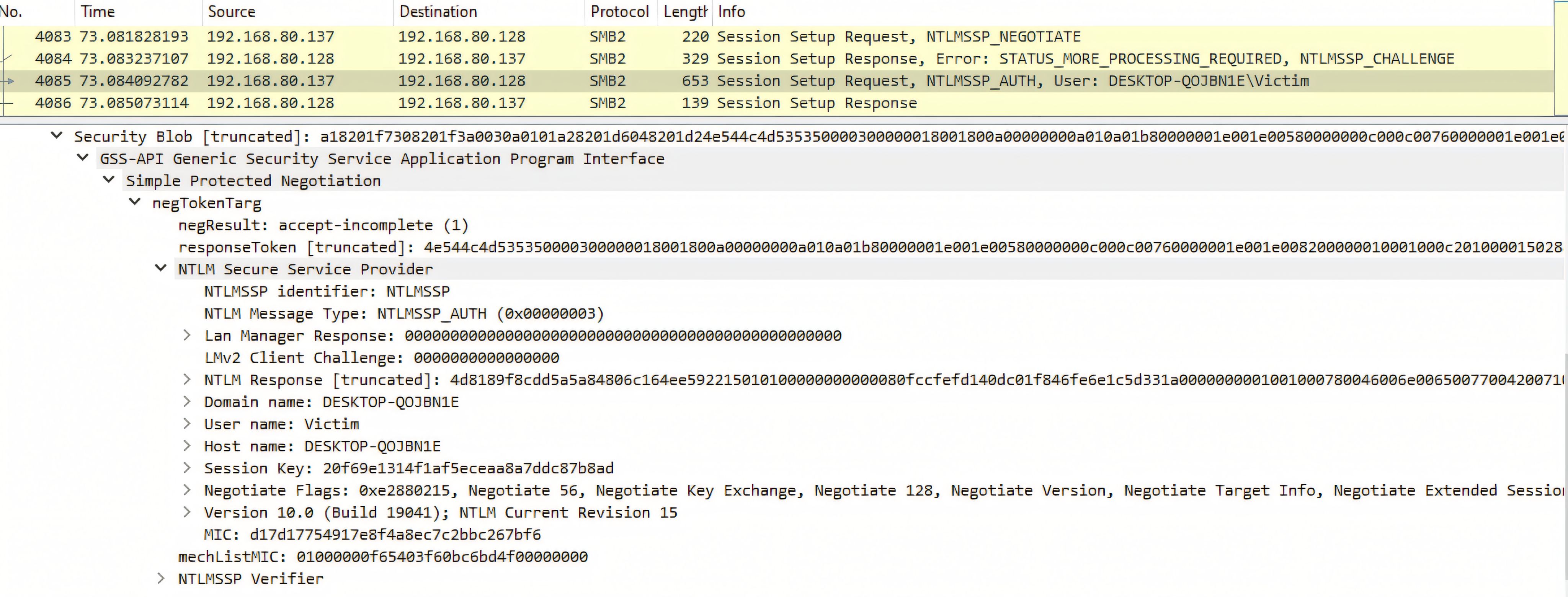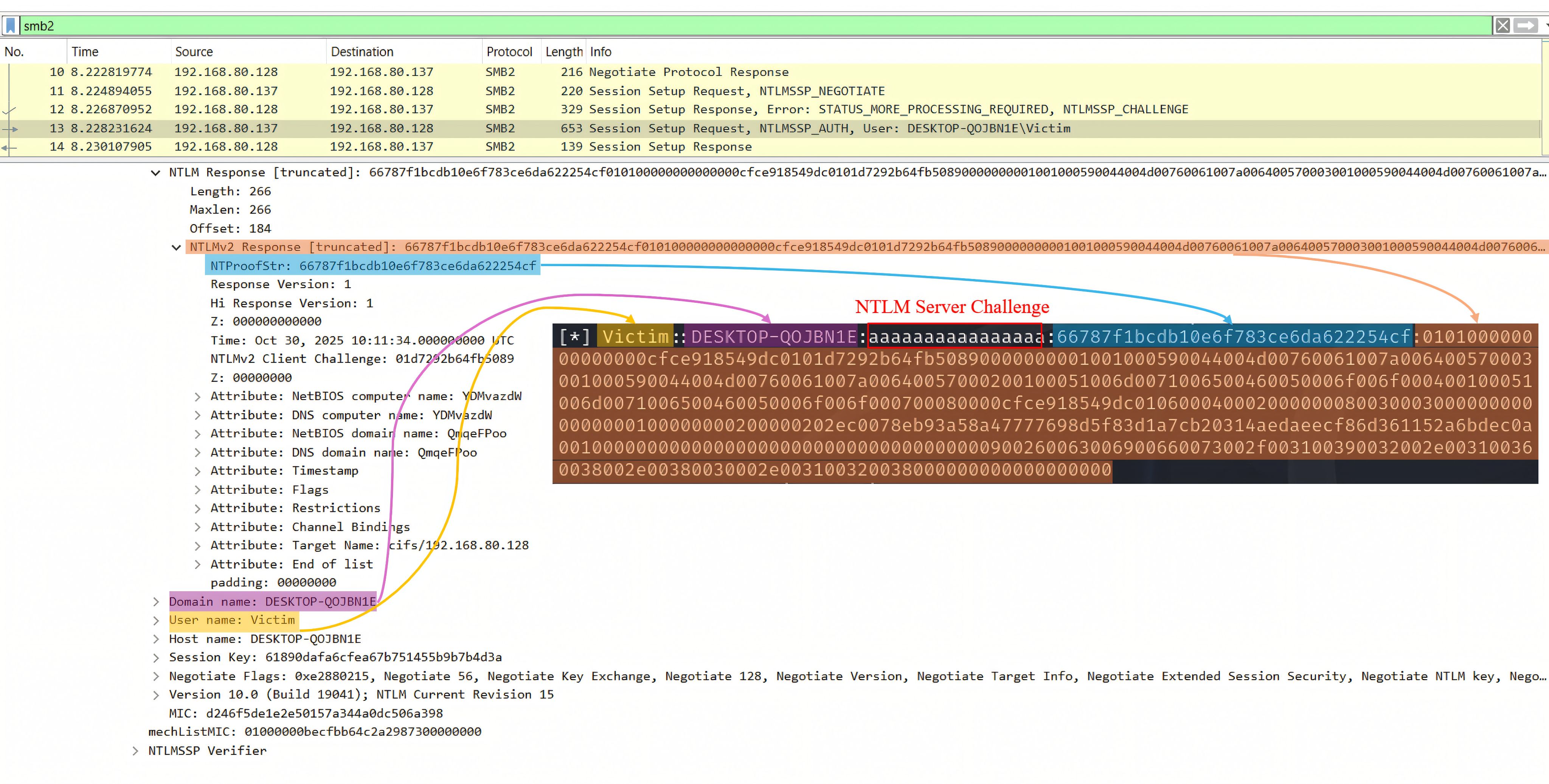 Although NTLM is a challenge–response protocol, it remains attractive to attackers because the authentication exchange is directly usable in hostile network conditions. During SMB session setup, the remote endpoint receives authentication metadata and the challenge–response values required to authenticate the client. If an adversary can operate the destination endpoint (e.g., an attacker-controlled SMB server) or can intercept/terminate the connection in transit, they may capture NTLM exchange material and attempt follow-on abuse such as NTLM relay or offline password guessing, depending on the environment’s protections