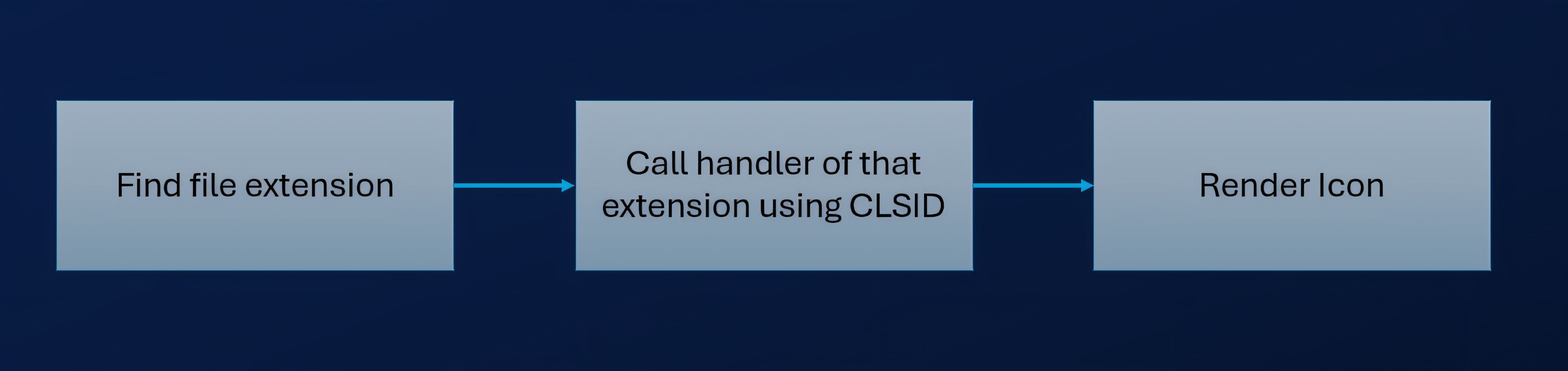When a folder is opened in File Explorer, Explorer enumerates the directory contents and determines each item type based on its registered file association (typically driven by the file extension). Windows then uses the corresponding shell class registration (for example, via the associated CLSID/ProgID mappings in the registry) to locate the appropriate shell handler - commonly a COM component responsible for icon extraction and rendering. Explorer invokes the relevant interfaces to retrieve and display the icon.