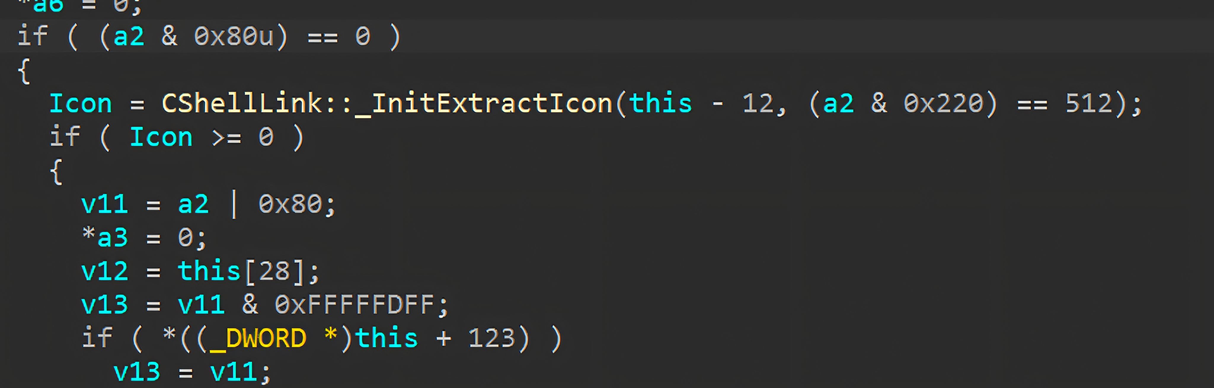 When Explorer renders a .lnk file, it determines the icon by calling CShellLink::GetIconLocation, which identifies where the icon should be loaded from (for example, the target binary, an explicit icon path, or a default system icon). As part of this flow, Explorer initializes icon extraction (_InitExtractIcon) and then executes the core resolution logic (_GetExtractIcon), which evaluates the icon source (via _CheckExtractLocation).