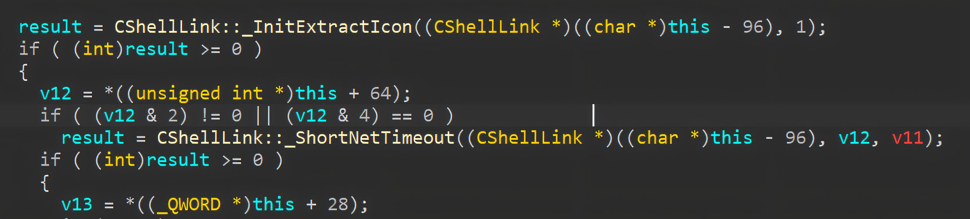 After resolving icon-related metadata, Explorer proceeds through CShellLink::Extract, which handles the shortcut’s target and completes the extraction workflow. As part of this path, Explorer invokes CShellLink::_ShortNetTimeout to apply shorter network timeouts when the shortcut references a remote location, reducing UI delays if the network target is slow or unreachable.