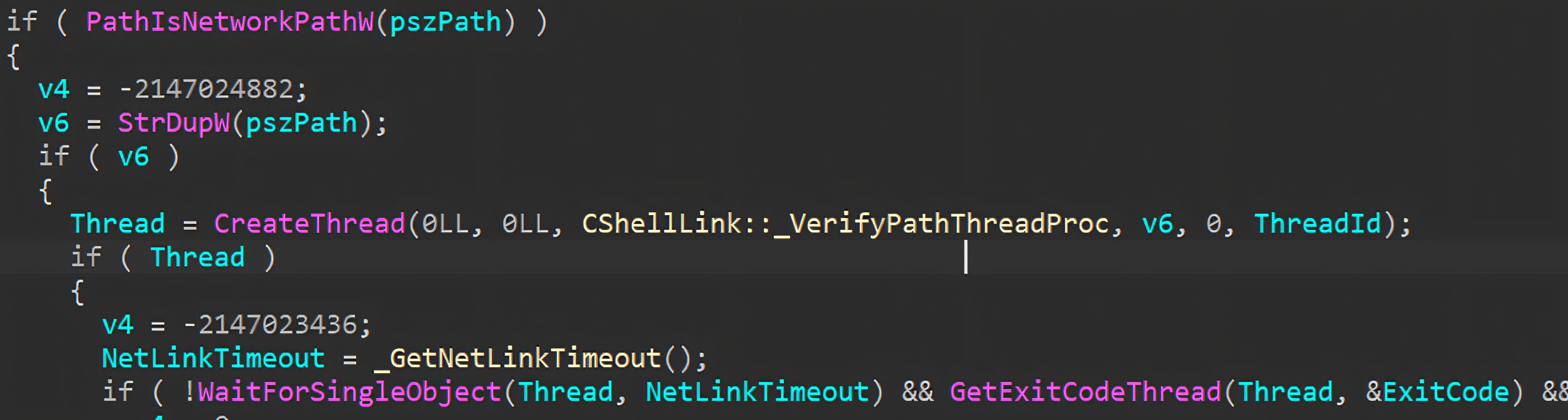 When the target is identified as a network (UNC) path, Explorer performs target validation asynchronously. It spawns a worker thread that runs CShellLink::_VerifyPathThreadProc, which checks whether the referenced target exists.