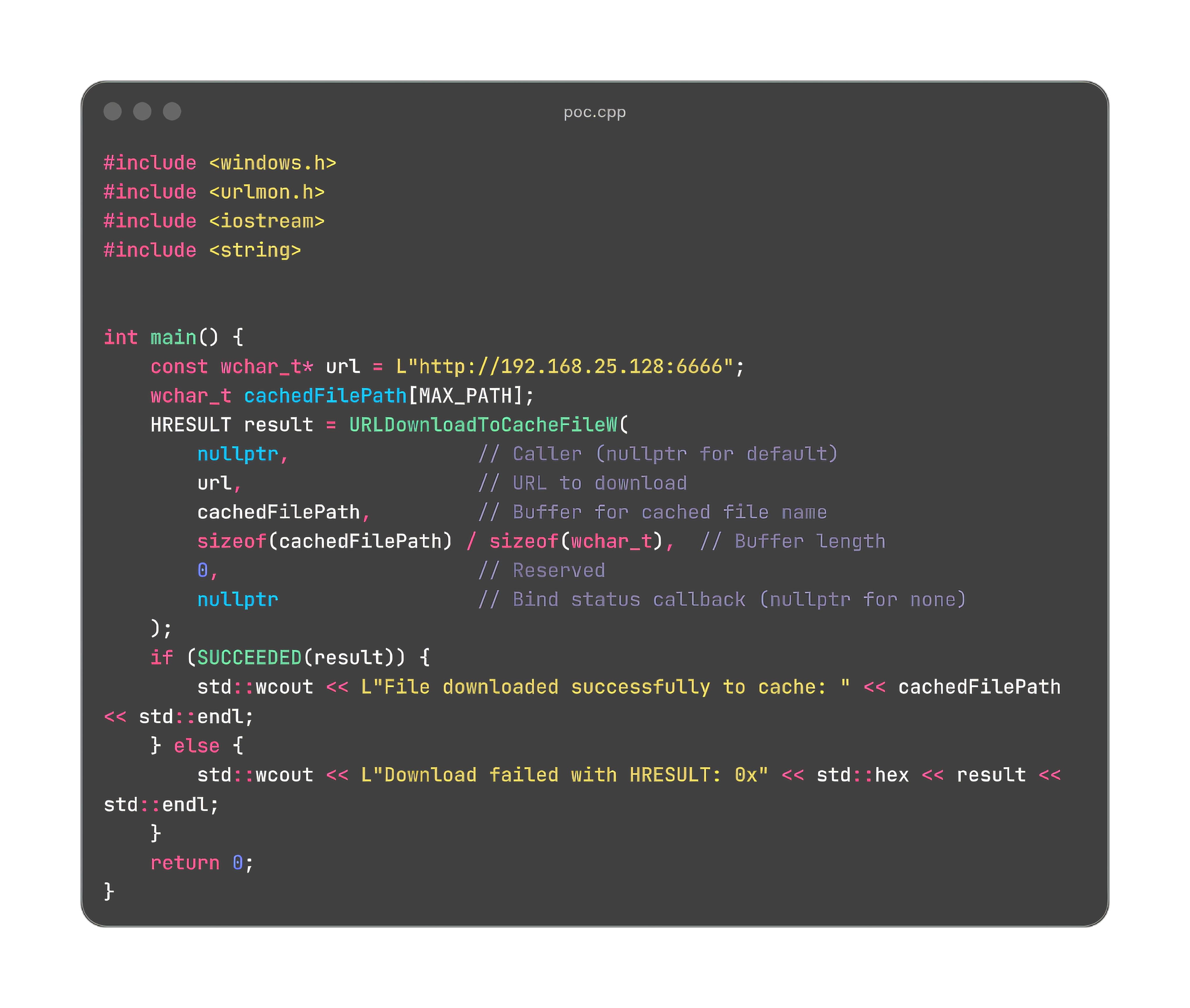To validate the behavior of URLDownloadToCacheFileW, we exercised the API with a minimal, standalone test.