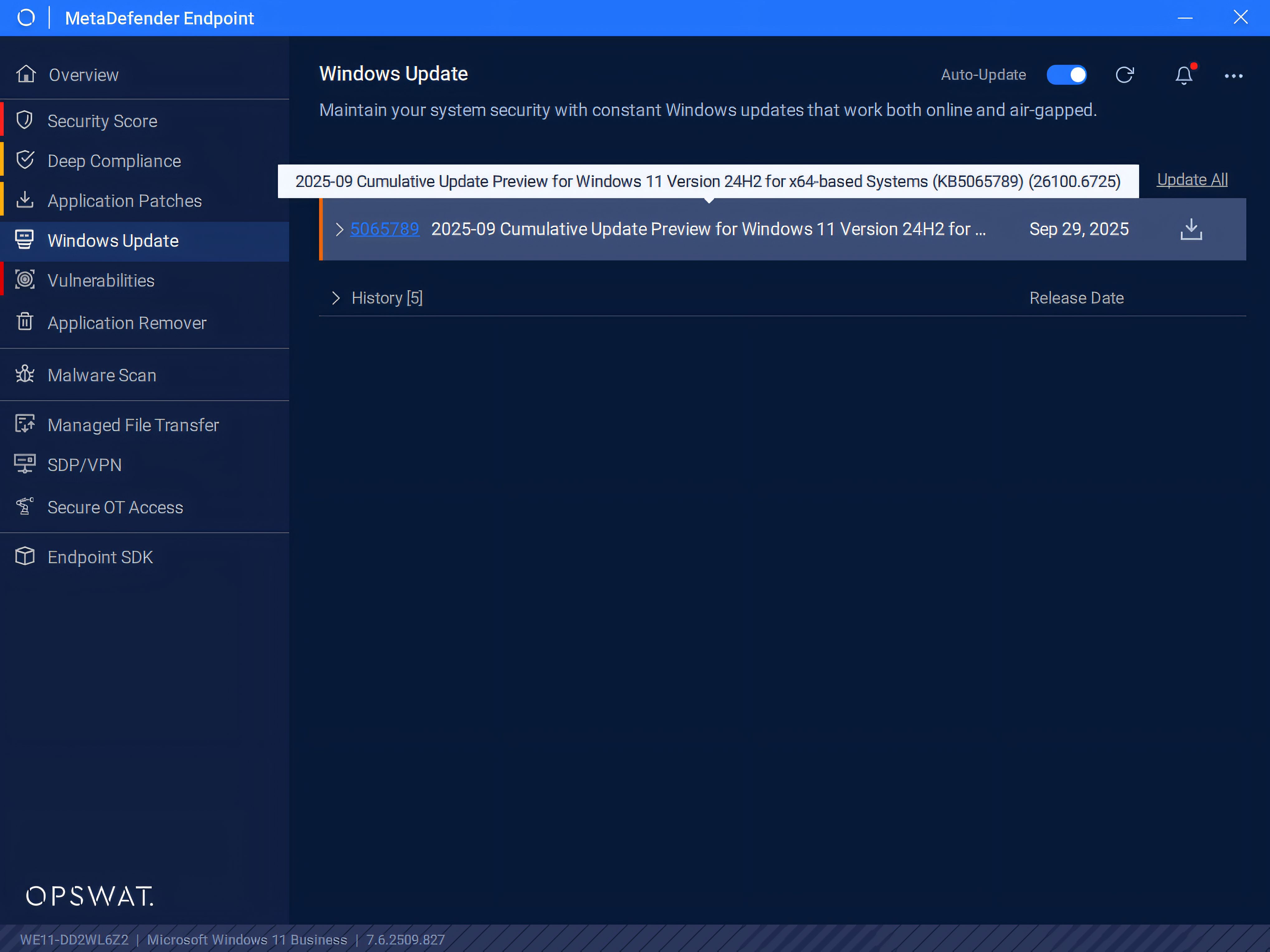 MetaDefender Endpoint™ supports these efforts and helps operationalize them at scale by giving clear visibility into exposure and patch readiness. With robust vulnerability and patch management capabilities supporting more than 1,100 applications, MetaDefender Endpoint proactively identifies endpoints running unpatched or out-of-date Windows versions as well as third-party applications and delivers recommended fixes.