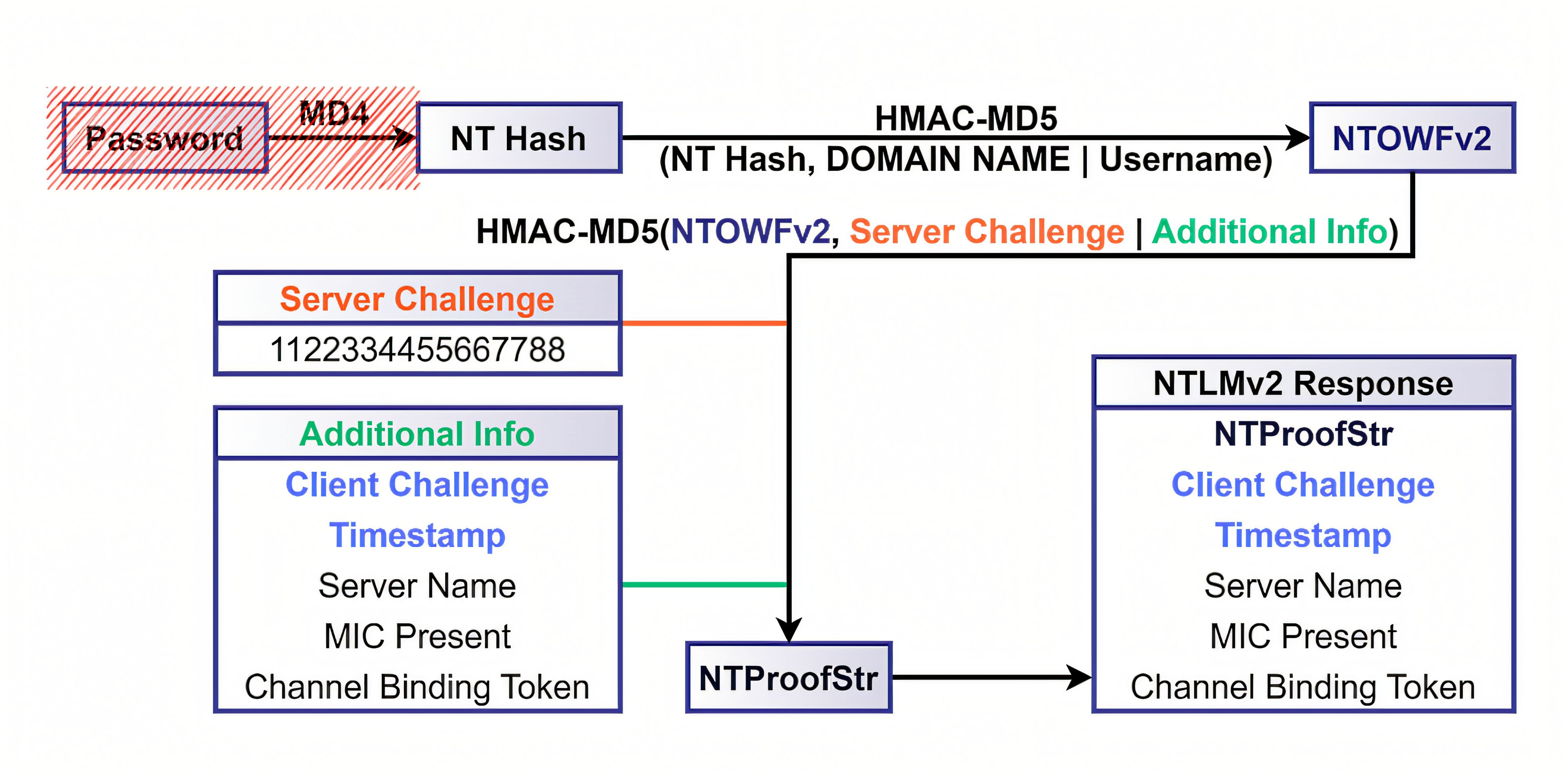 To improve this, Microsoft introduced NTLMv2, which strengthens the response computation. In practice, NTLMv2 replaces the older DES-style response construction with an HMAC-MD5-based scheme and incorporates additional context into the response, making it significantly more robust than NTLMv1 against several classes of offline recovery techniques.