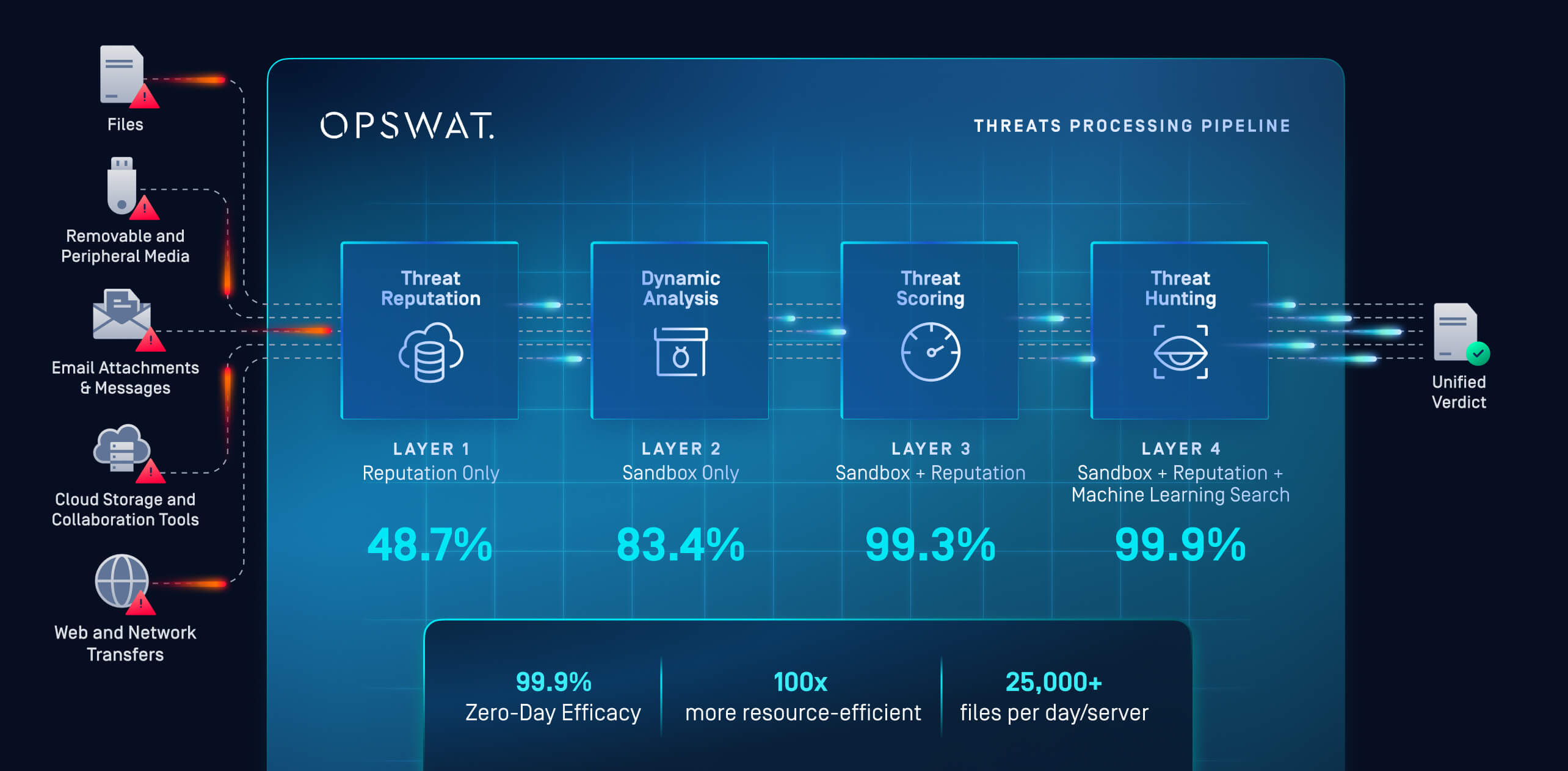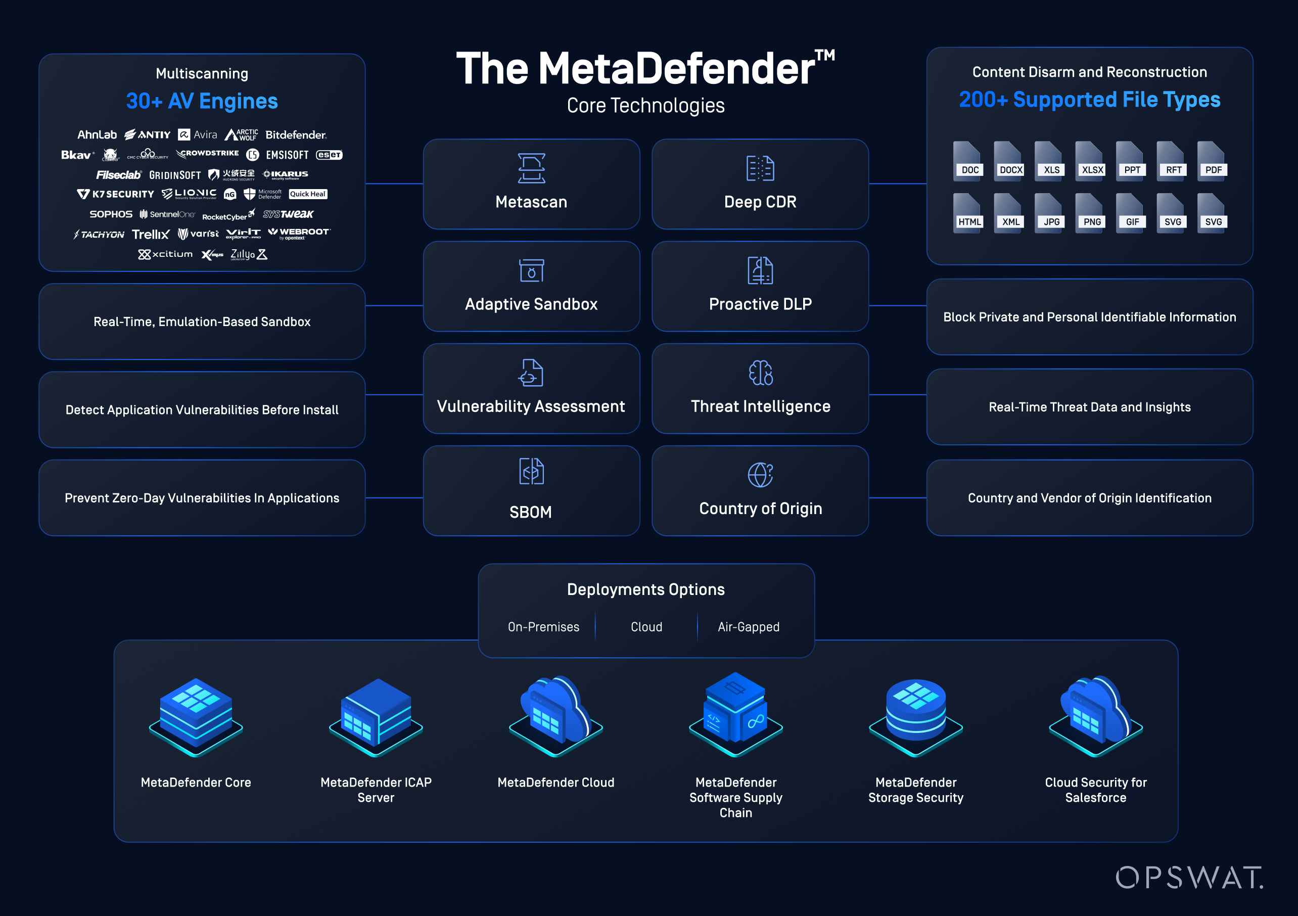 OPSWAT uses multiple scanning technologies to provide deep, defence-in-depth file inspection. It leverages 30+ anti-malware engines with signatures, heuristics, machine-learning detection, AI threat detection engine, alongside file reputation and hash analysis for rapid classification of known threats.