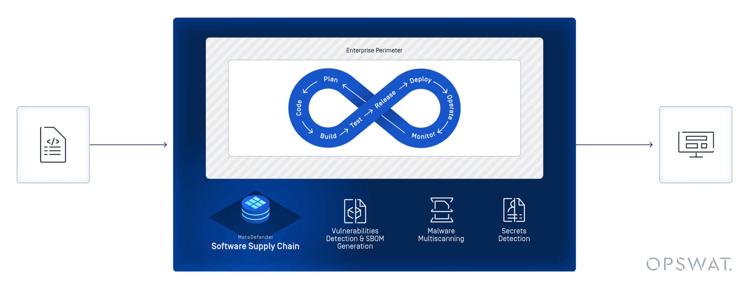 MetaDefender Software Supply Chain™ embeds zero-trust inspection into the SDLC by combining multiscanning with 30+ antivirus engines, hard-coded secret detection, deep container layer analysis, vulnerability identification, and native integrations with repositories and CI/CD pipelines to prevent malware, exposed credentials, and dependency risks while supporting compliance with frameworks such as the EU Cyber Resilience Act.