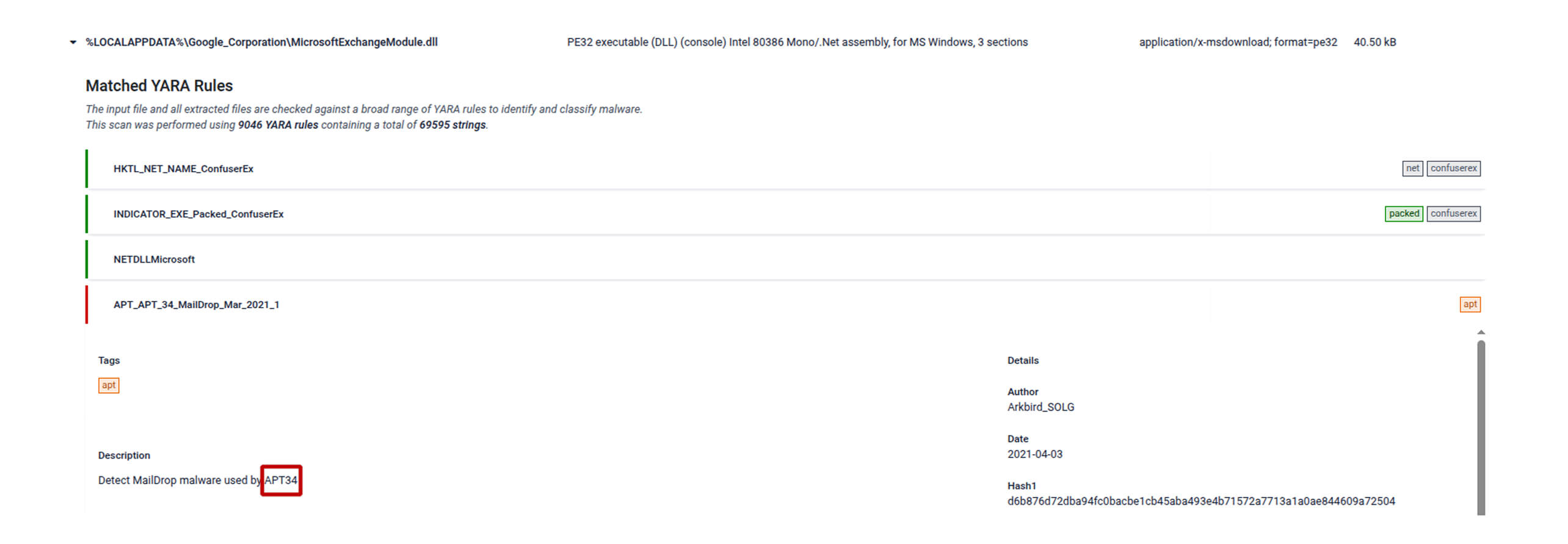 A filescan.io report flags MicrosoftExchangeModule.dll as a suspicious .NET DLL matching multiple YARA rules.