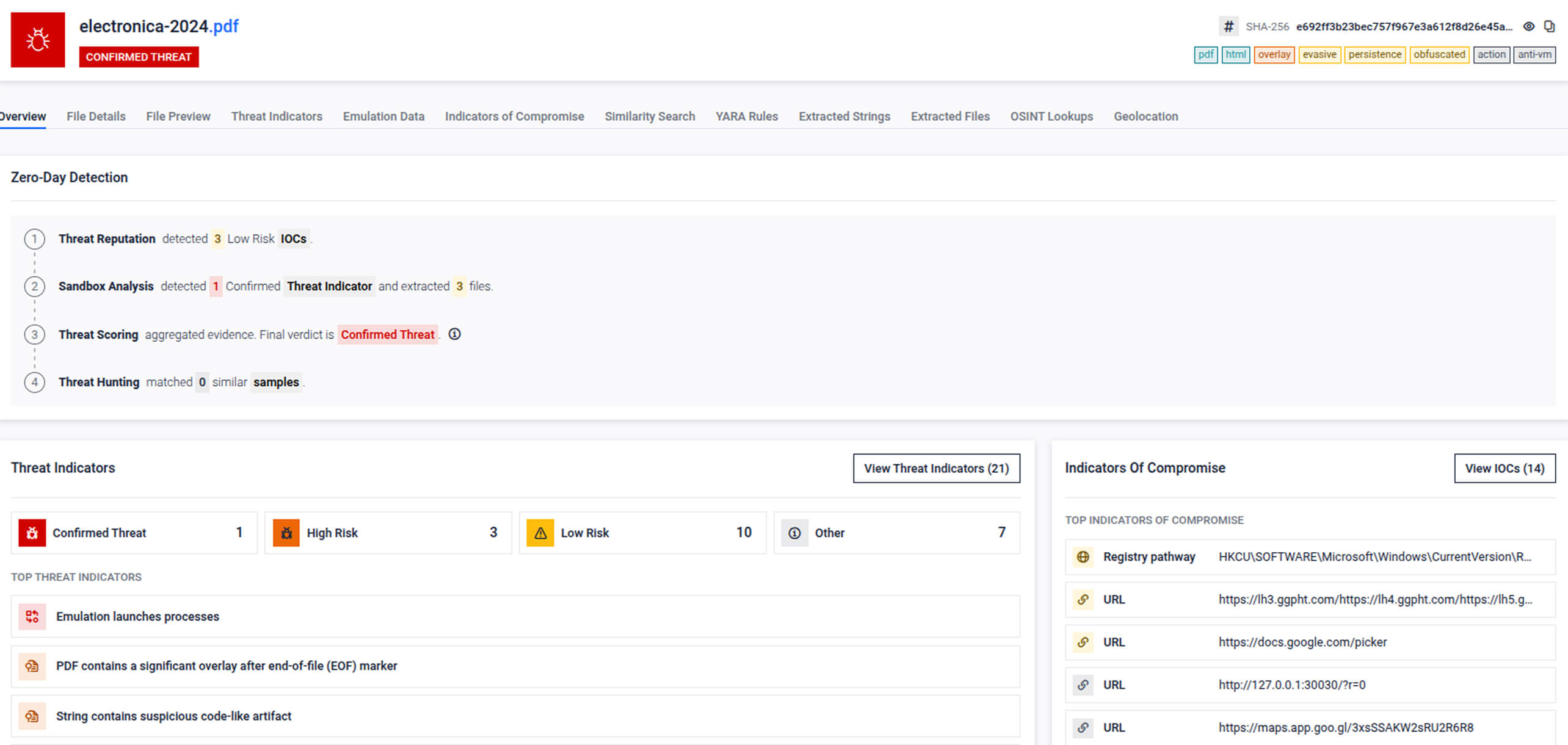 The PDF is identified as a confirmed threat, with sandbox analysis detecting malicious behavior and extracting suspicious files.