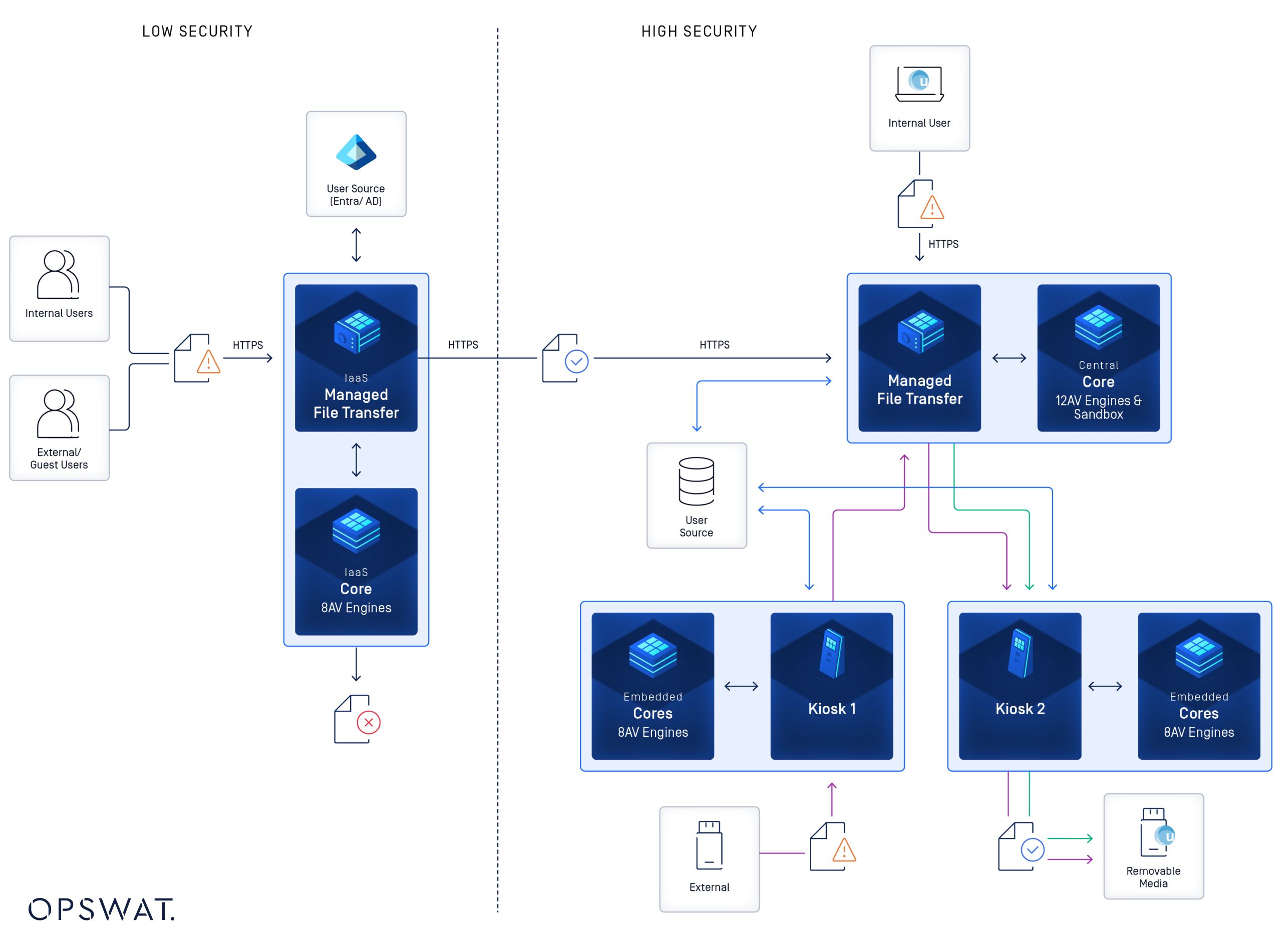 By deploying the integrated OPSWAT platform across all global facilities, the organization ensured that every file entering the nuclear environment was subject to zero-trust inspection workflows. Regardless of source or entry point: removable media, transient devices, onsite staff, or external third parties, all files were then processed through multi-layered defense controls to detect known and unknown threats targeting their environment.