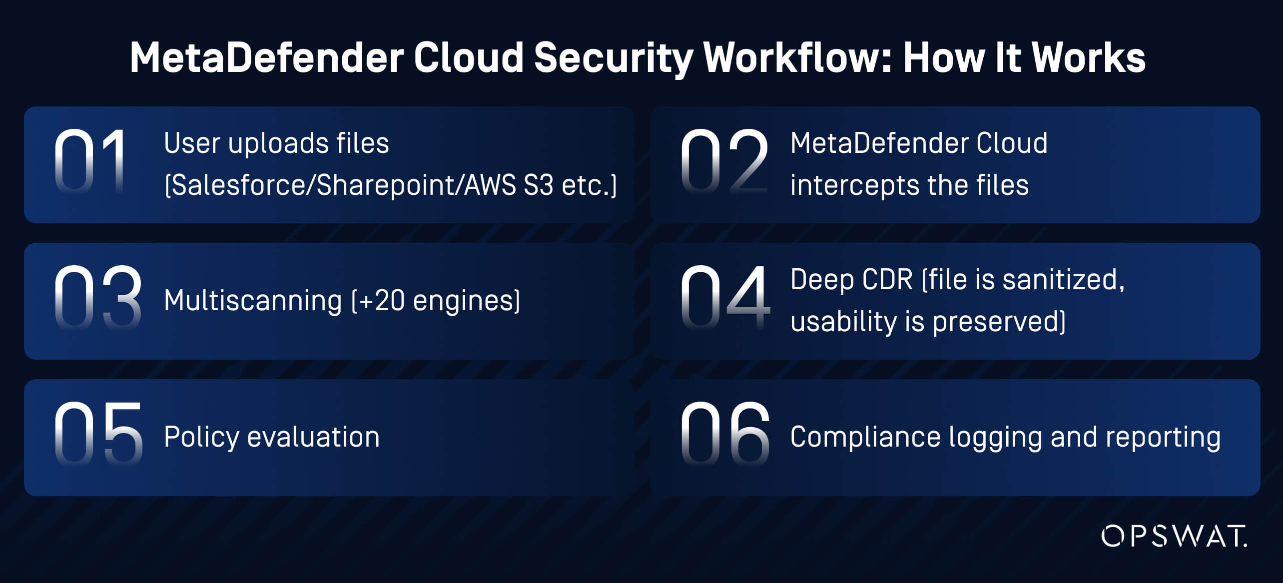 MetaDefender Cloud technologies intercept files at the moment of upload before they're stored or accessed by users.