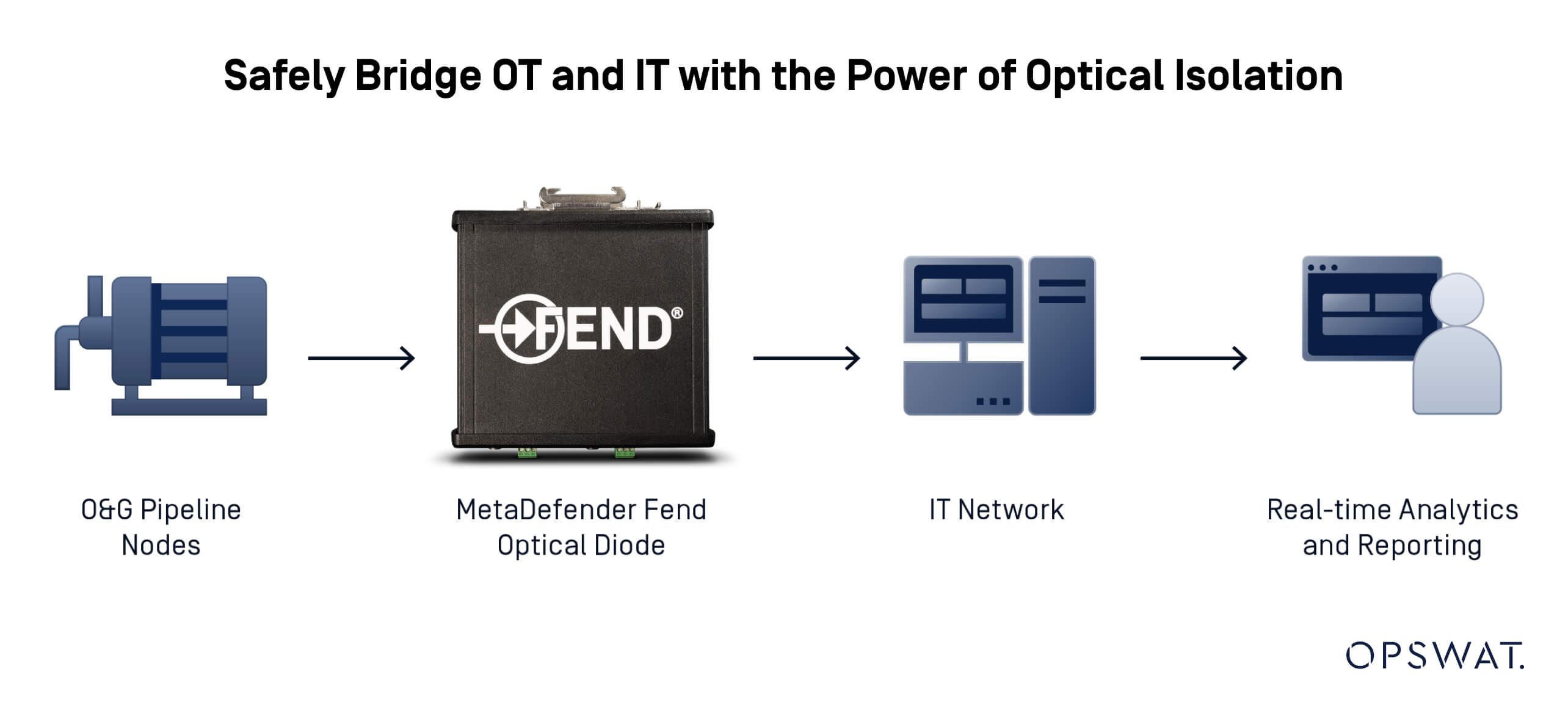 MetaDefender Optical Diode (Fend)’s easy-to-deploy hardware brought data diode protection to gas pipelines and oil refineries at a fraction of the price of traditional solutions. By partnering with OPSWAT, our customer achieved visibility across the rest of the value chain, enabling real-time analytics, flow-rate modeling and predictive maintenance while protecting operational networks and assets.