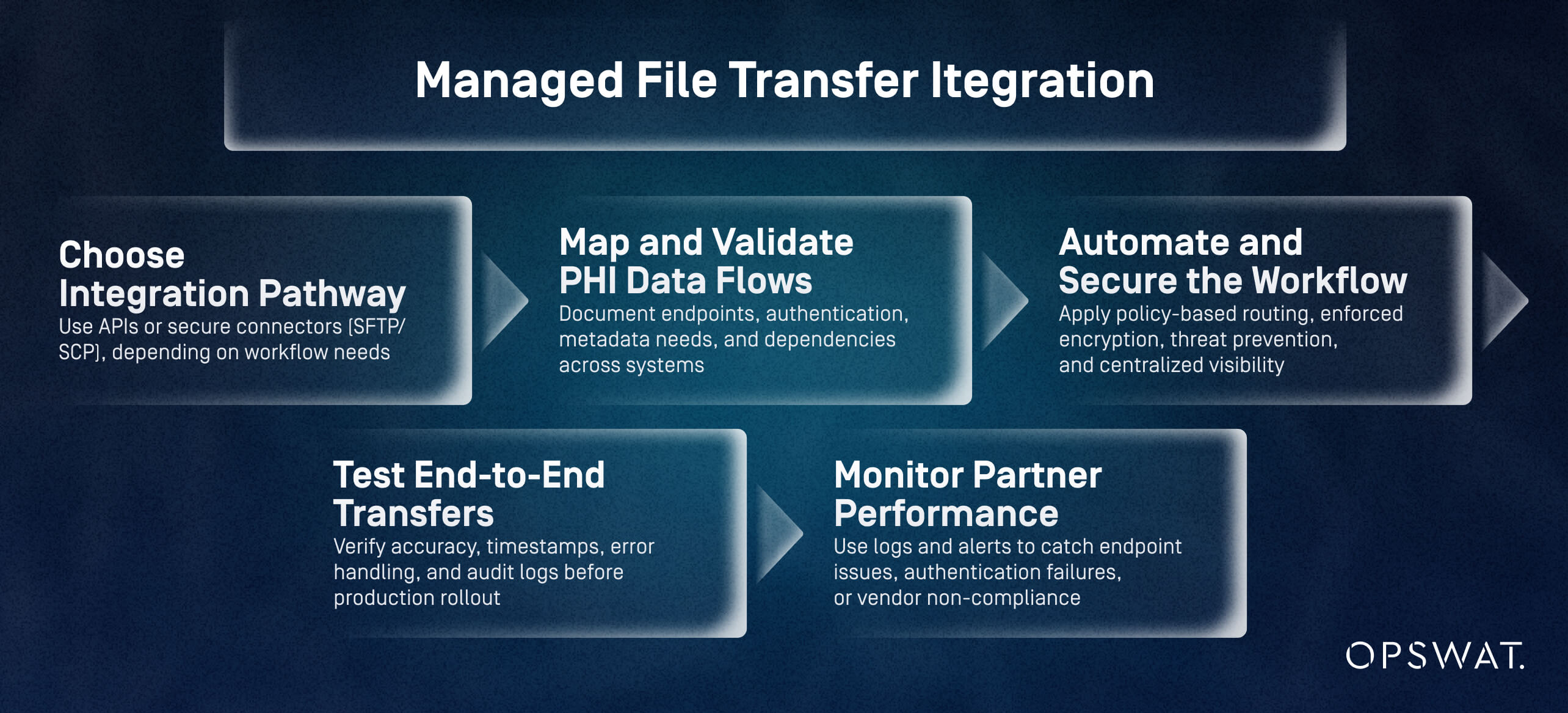 Healthcare organizations integrate MFT with EHR and vendor systems by selecting secure connection methods, mapping PHI flows, and automating file transfer policies. EHRs and adjacent vendor systems exchange vast amounts of PHI, making integration a critical success factor.