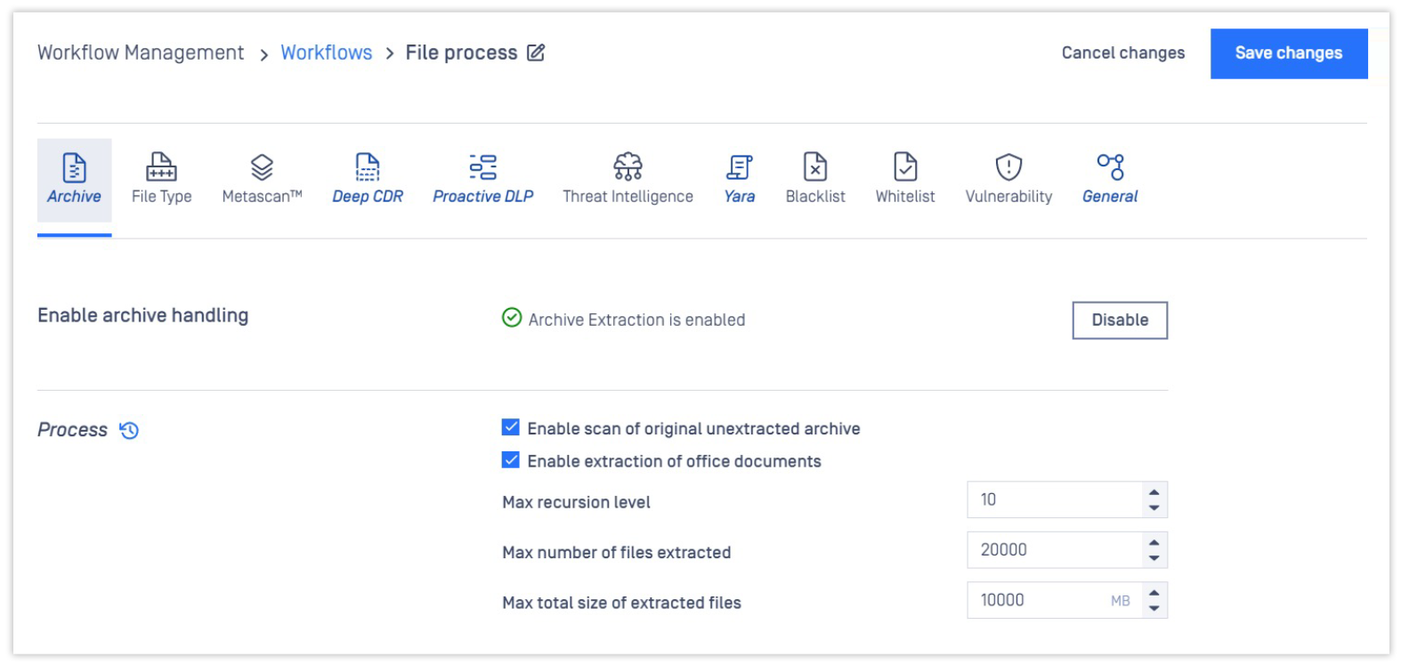 In order to boost archive handling performance, we created a new compression archive engine, which is dedicated to processing archive sanitization. To comply with sanitization best practices for protection against unknown malware, Deep Content Disarm and Reconstruction (Deep CDR) license is required to enable the archive sanitization feature.