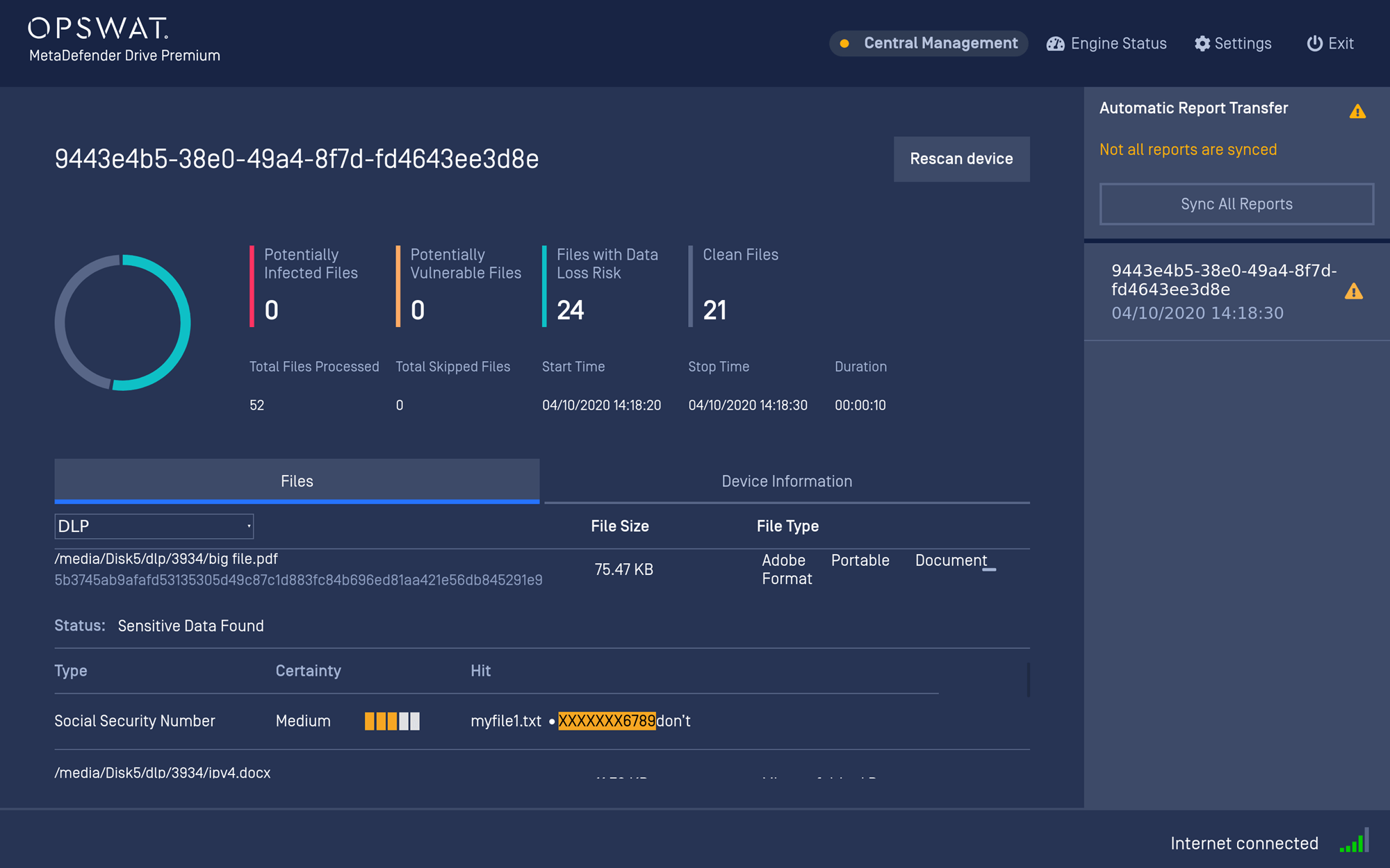 In this release, we introduce the addition of OPSWAT's Proactive Data Loss Prevention (DLP) feature in our MetaDefender Drive Advanced Edition. This addition allows for the detection of not only malware and software vulnerabilities, but also personally identifying information (PII) such as social security numbers, credit cards, and custom patterns. For any organizations that need to maintain compliance with regulatory requirements, MetaDefender Drive can help with a deep analysis of data leakage on any transient assets to prevent a potential data breach.