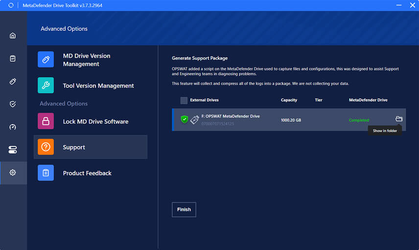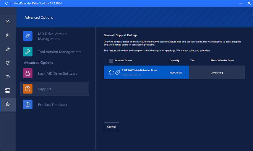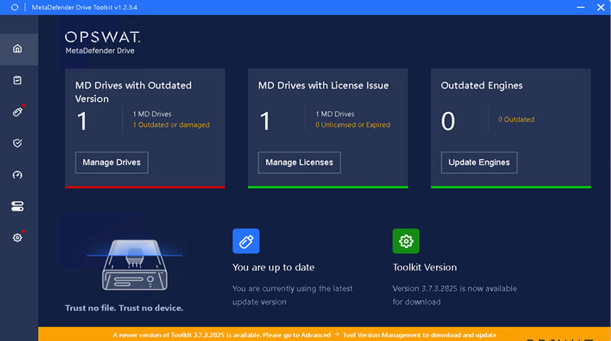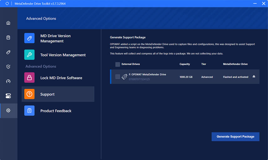 The latest version of MetaDefender Drive Toolkit v3.7.3 focuses on improving the user experience with improved update notifications, clearer support package generation workflows, and a cleaner interface.