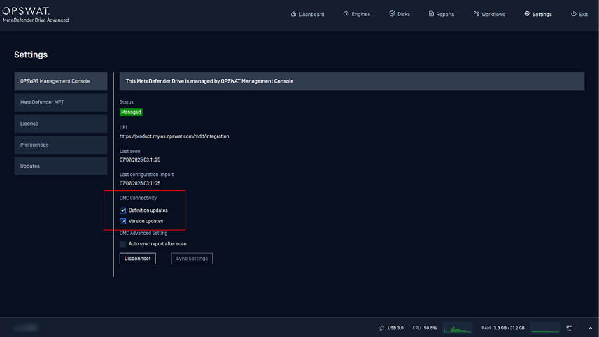 3. From the MetaDefender Drive user interface, go to OPSWAT Management Console under the Settings tab, and ensure the checkboxes for Definition Update and Version Update are selected.