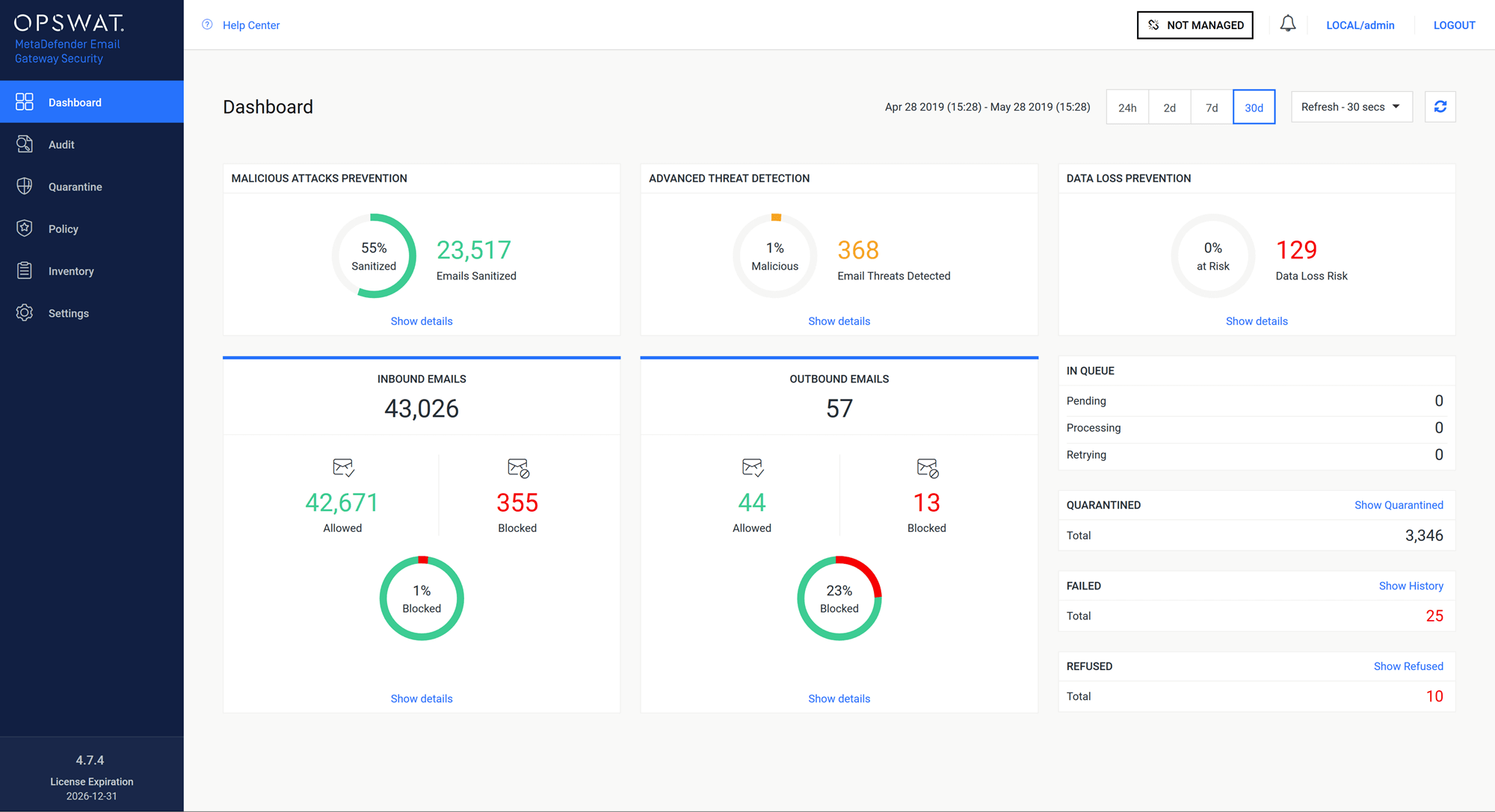 MetaDefender Email Security protects against email borne threats that evade sandboxes and bypass advanced threat protection solutions such as those offered with Office 365 and G Suite. Using industry-leading Multi-Scanning and Deep Content Disarm and Reconstruct (Deep CDR™ Technology) technologies, MetaDefender Email Security prevents zero-day attacks and unknown threats. It provides close to 100% known threat detection, all without affecting email server performance. MetaDefender Email Security also includes Proactive Data Loss Prevention (Proactive DLP) capabilities to detect and block sensitive content in emails.