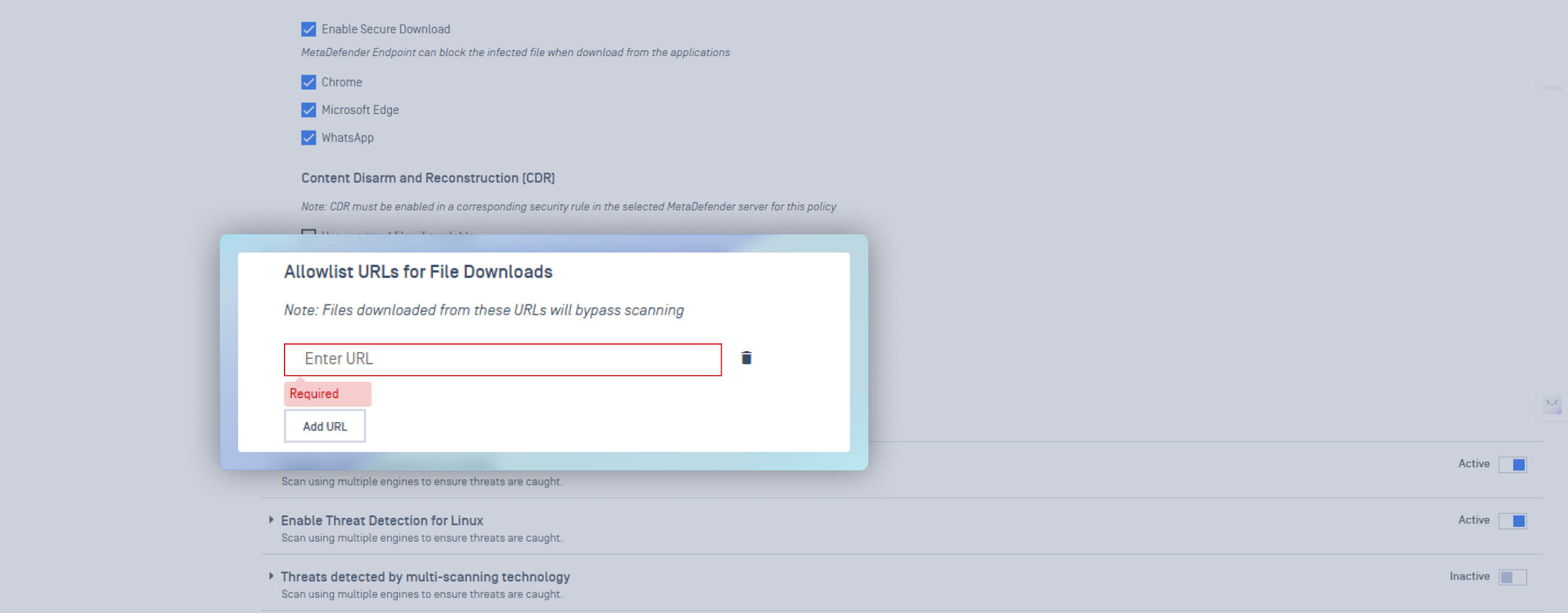 To provide greater flexibility while maintaining security, support for URL allowlisting has been added to the Download Protection feature. This enables administrators to specify trusted URLs or domains from which users can download internal or approved resources.
