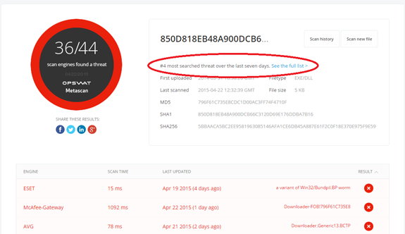 Since the release of our statistics page on Metascan Online a few weeks back, we've been working on making this information more accessible, regardless of how you get to the most searched-for threat results. Now when you visit the scan results or history pages, if the detected threat is on the top threats list, you will see an indication of its status in the summary section. Next to the summary you will also find a link for a full list of the most searched threats within the Metascan Online database.