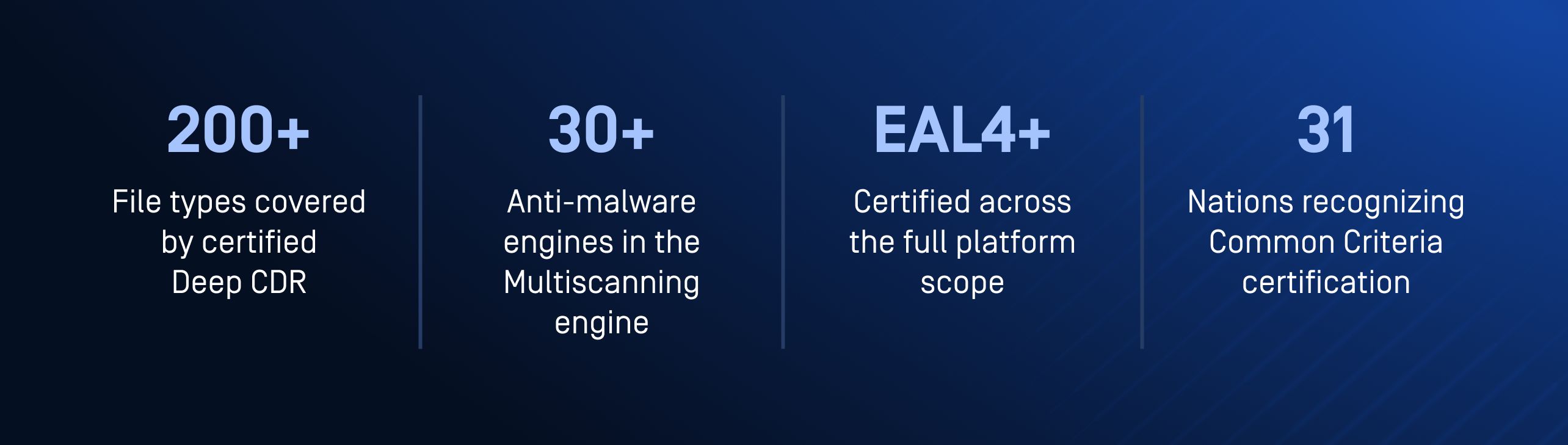 Recursively sanitizes more than 200 file types by removing all potentially malicious content — scripts, macros, embedded objects, and out-of-policy elements — and regenerating fully functional, safe files. Deep CDR™ Technology is detection-agnostic: it neutralizes threats it has never encountered before, including zero-day attacks, by operating on file structure rather than threat signatures. Certifying a reconstruction-based prevention mechanism at EAL4+ independently validates an entirely different class of security logic.