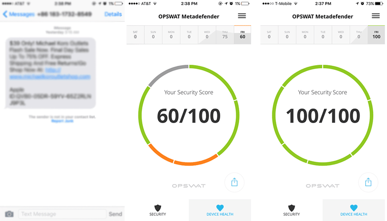 Below, you can see an example of an SMS phishing attempt and a user's mobile device health score in MetaDefender, both before and after they have addressed security concerns.