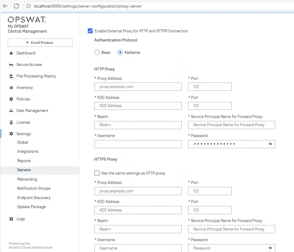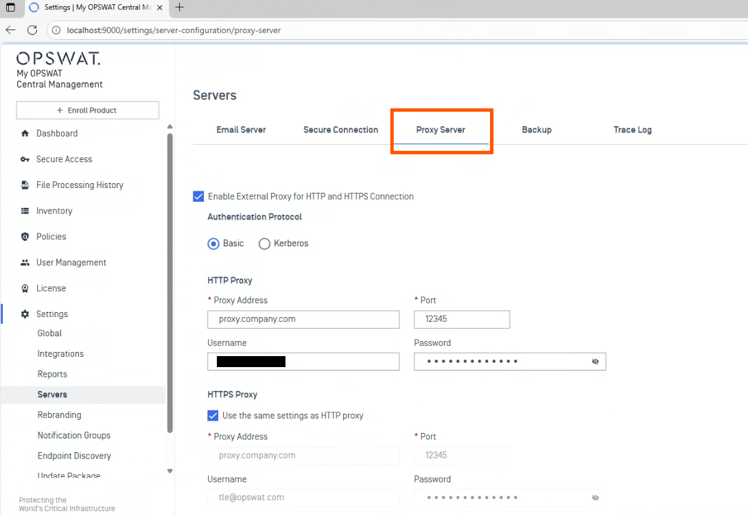 - HTTPS proxy: encrypt the connection between My OPSWAT Central Management and the proxy server
