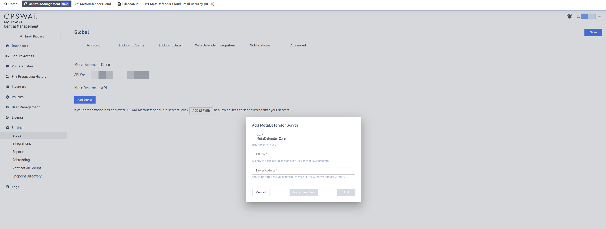 - Log into your My OPSWAT Central Management Console, then navigate to Settings>Global>MetaDefender Integration.