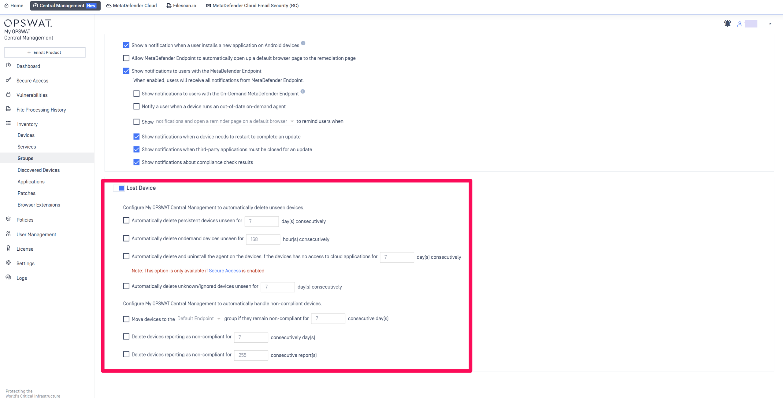 Automatic device removal is enabled via the Console’s Lost Device settings, which can be adjusted either for individual devices or for groups of devices, as follows: