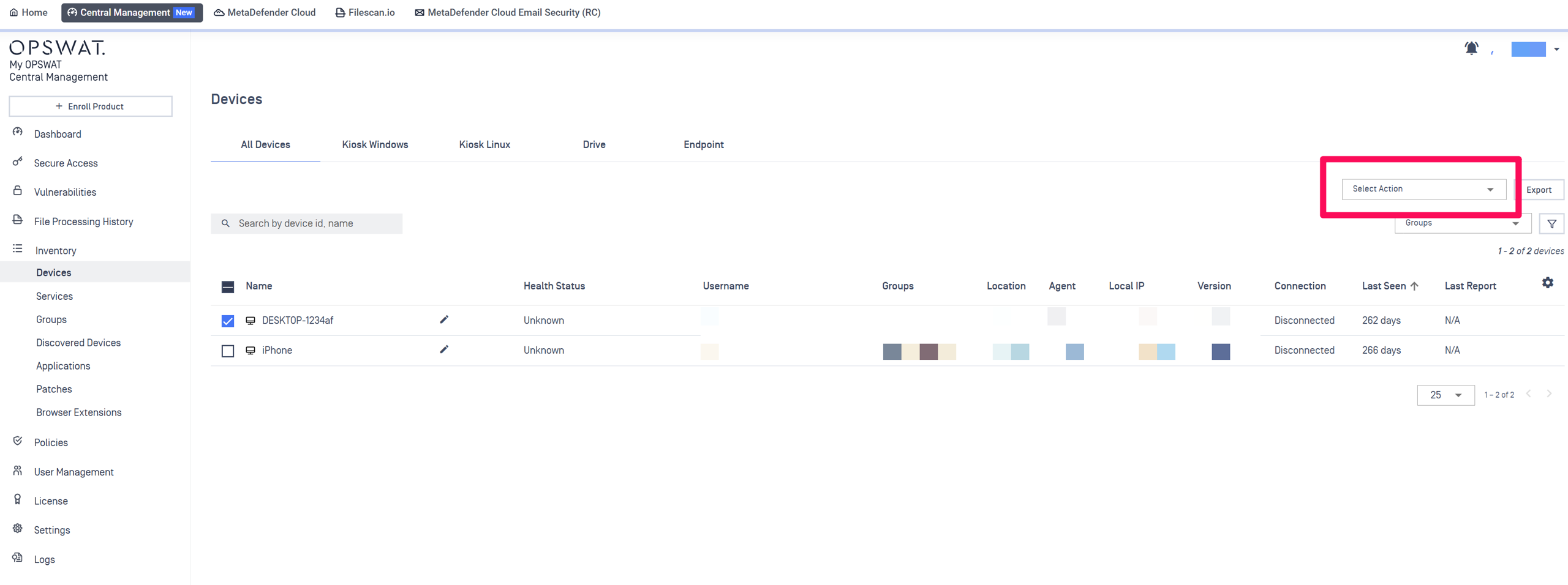 Once selected, expand the Actions drop-down menu in the upper right-hand corner of the device list, also illustrated below.