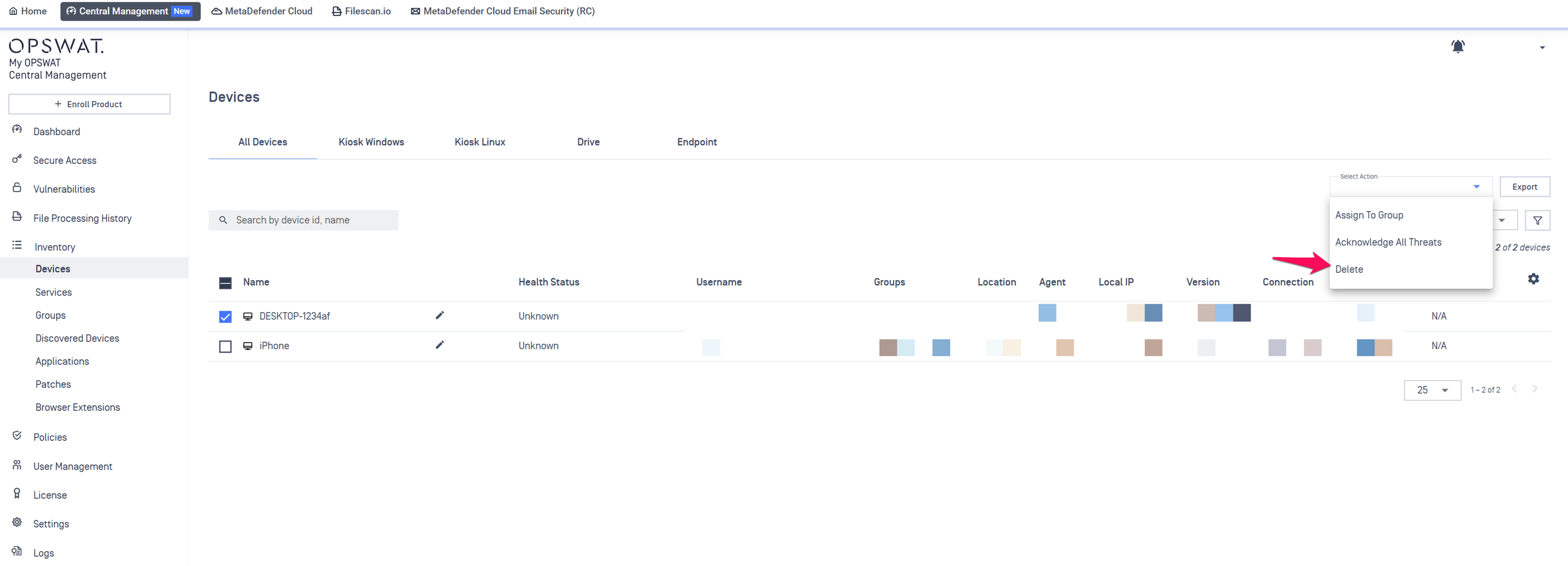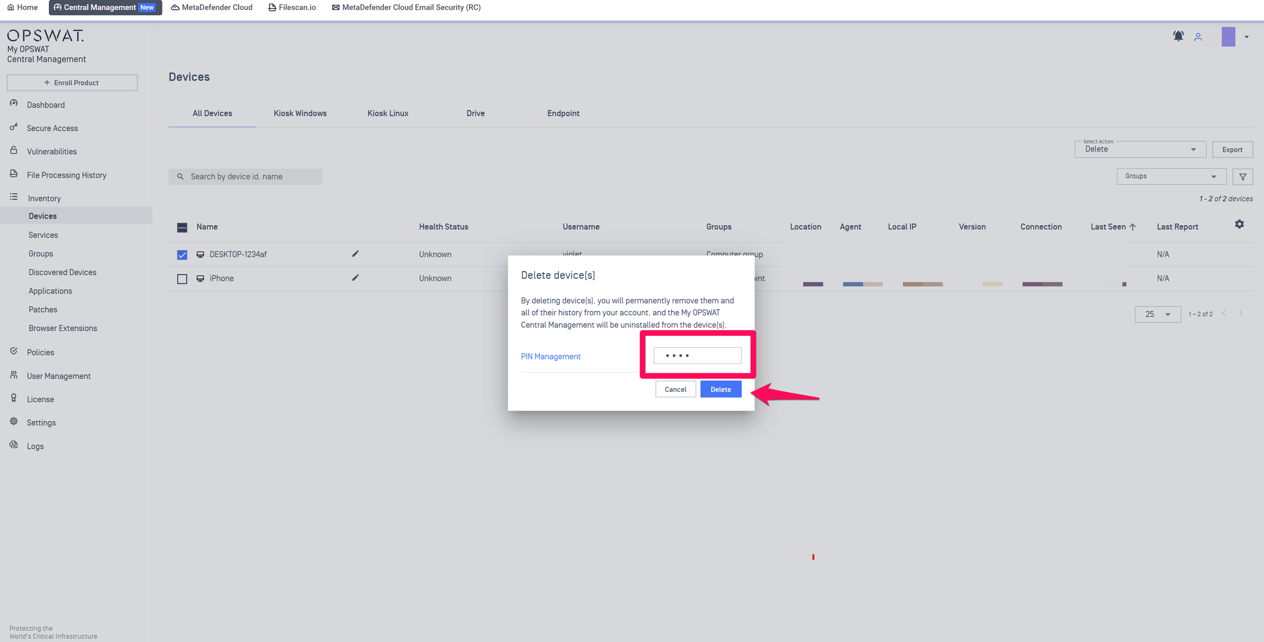 How can I delete a device from My OPSWAT Central Management?