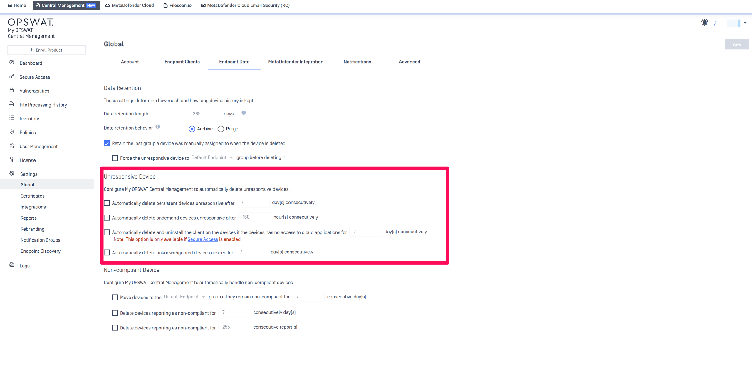 The My OPSWAT Central Management Console facilitates two methods of guest MetaDefender Endpoint device removal: