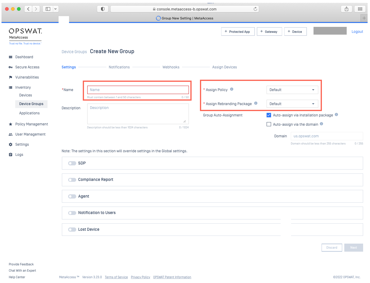 - Fill in the group name and assign a policy and rebranding package (if applicable). Notification and Webhook settings are not required during the group creation process, and can be updated at a later stage.