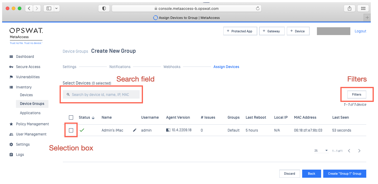 - Once located, check the selection box alongside each device to be added to the group, also illustrated in the screenshot below.