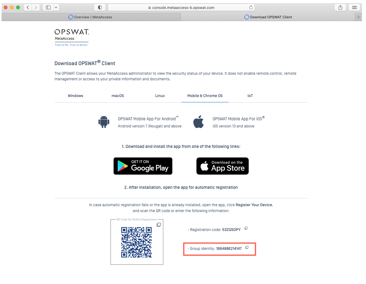 - You will be redirected to the device group download page, where you should click on the Mobile & Chrome OS tab to view the Registration Code and Group Identity alongside the Captcha at the bottom of the page. See the screenshot below.