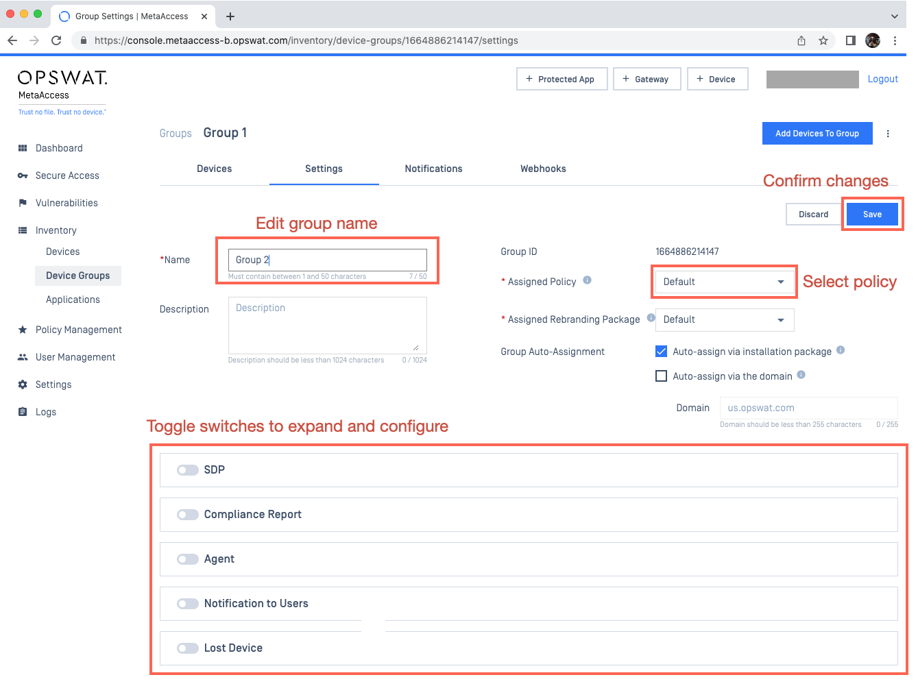 - Click on the group you would like to update to access the device group details, then click on the Settings tab.