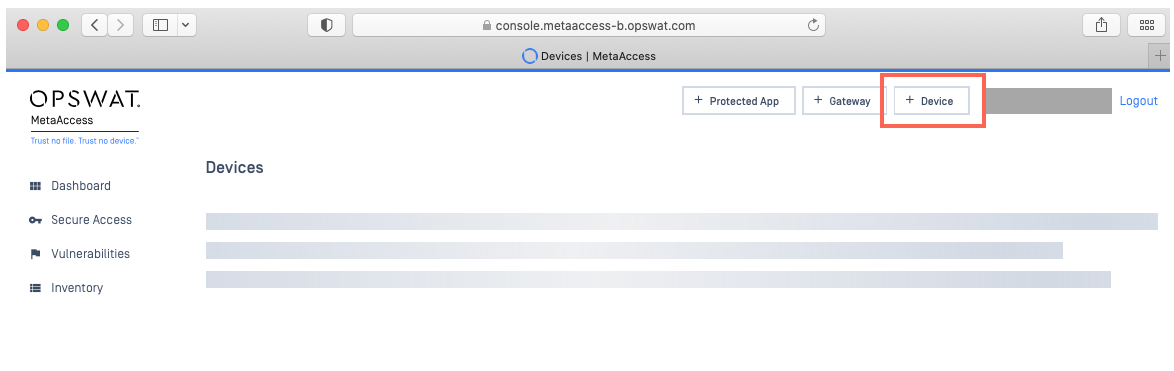 - Log into the Console and click the +Device button in the top right-hand corner of the screen, as illustrated below.