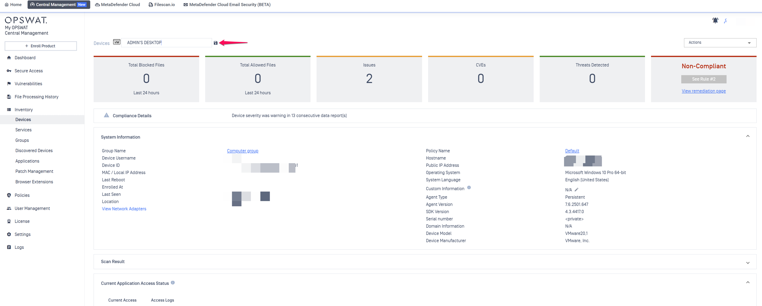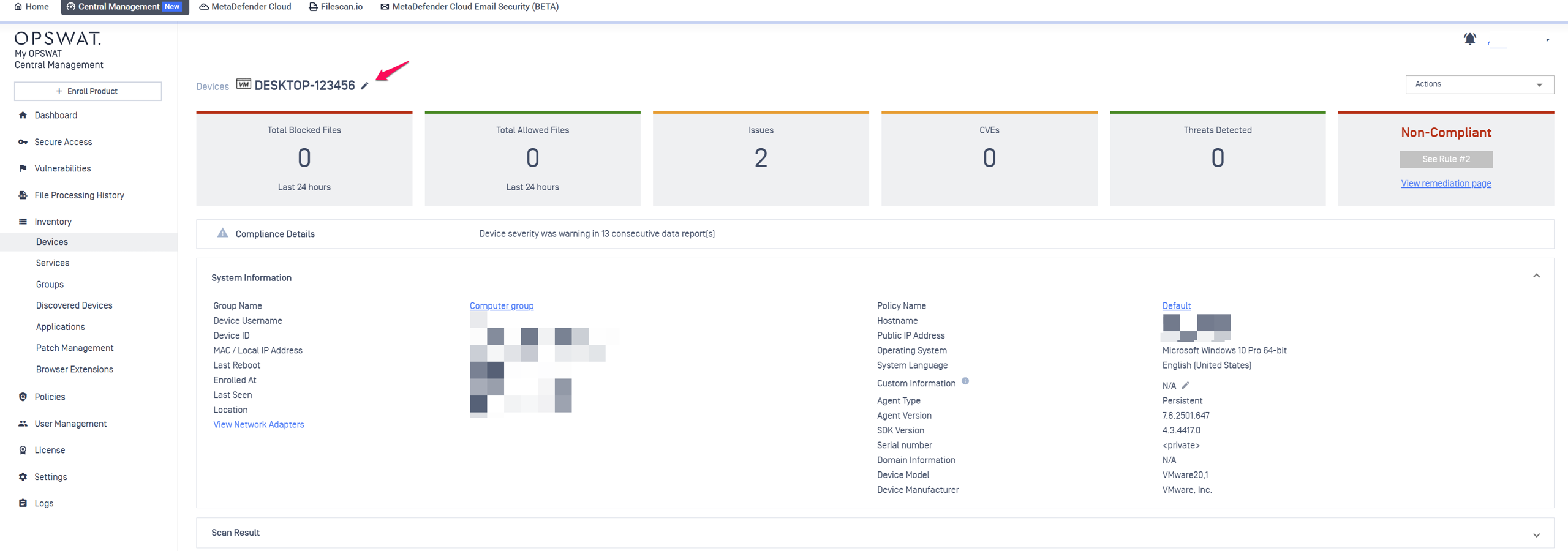 - Log into your My OPSWAT Central Management Console and navigate to Inventory>Devices.
