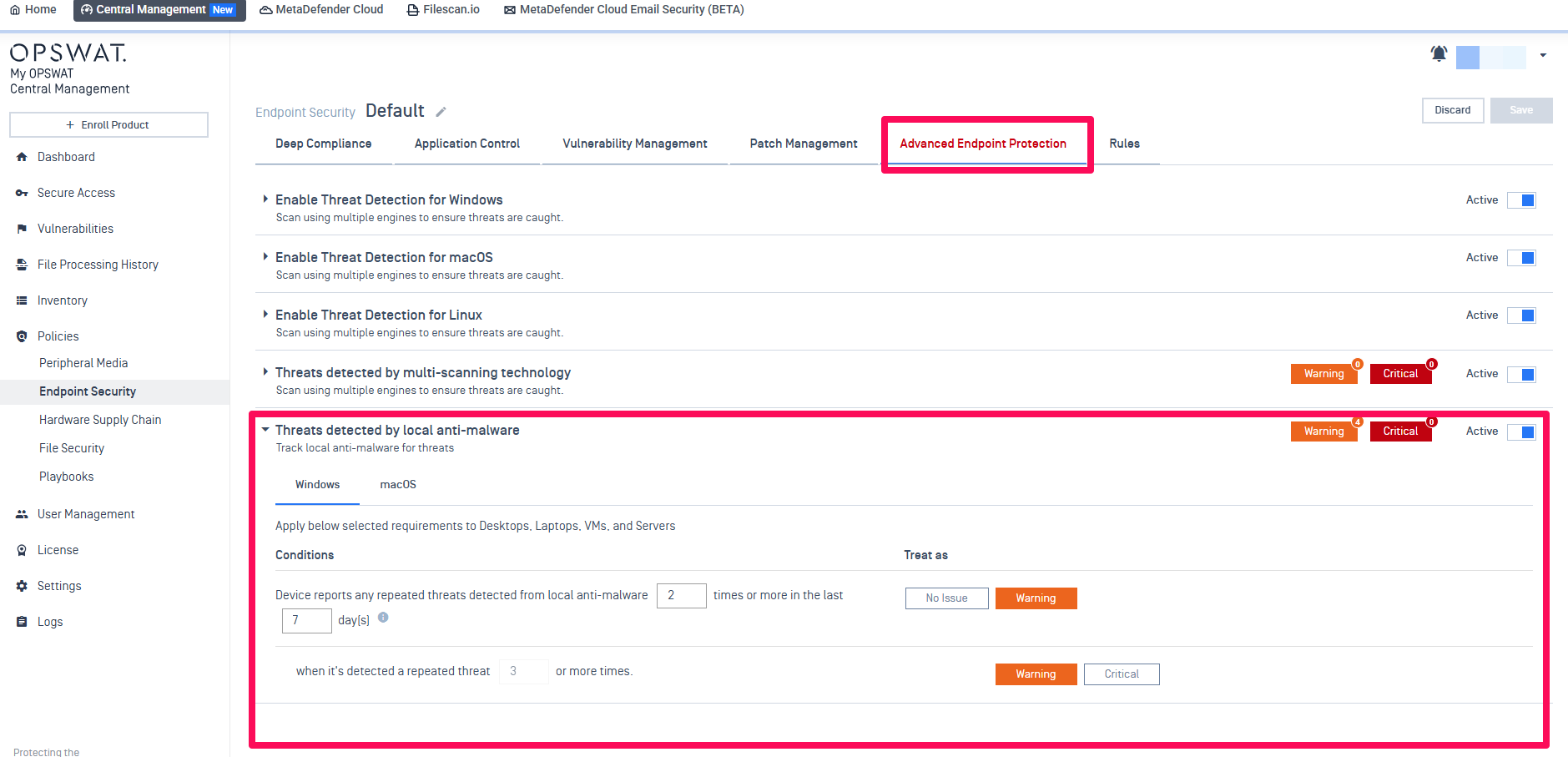 Administrators have the option to configure this feature via the My OPSWAT Central Management Console>Policy Management>Policies>Endpoint Security>Relevant Policy>Advanced Endpoint Protection tab, as illustrated below.